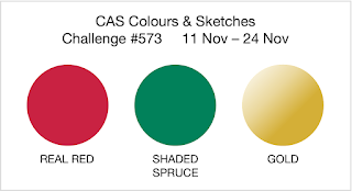 Hello crafty friends. It’s time for a new challenge over at CAS Colours & Sketches – I’m hosting this month and decided it was time to go with a potentially festive palette featuring red, green & gold! It gave me an excuse for a final play with Linda’s Floral Rounds, turning one of the images into a sparkly bauble (and I have now put them away for a while!)