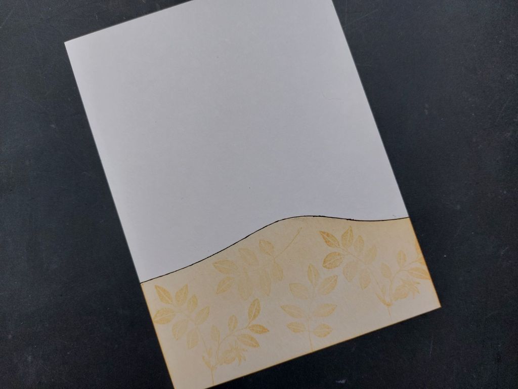 First up, though, I needed to get the layout onto my card. I used one of the masks from the ‘meadow’ scene in the 6×6 Landscapes set, laying it on a topper cut to fit an A6 card and brushing ‘dried marigold’ Distress Oxide across it. I stamped some of the leaves from the set onto the background, again using the ‘dried marigold’ and then ran a micron pen along the edge of the mask before lifting it off.