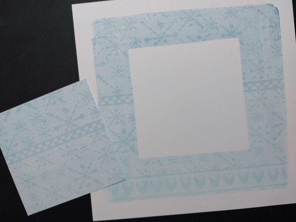 Let’s start with the background. I brayered ‘uncharted mariner’ and ‘peacock feathers’ Distress Oxides onto my 6×6 Gel Press Plate and then laid a piece of the BOW-WOB paper onto it, rubbing it very lightly. The white areas of the paper will pick up ink from the gel plate, with the black acting as a resist, leaving the imprint on the plate. I then took one of Clarity’s 7×7 squares of stencil card and popped one of the small 3.5″ squares into the centre of it, before flipping the gel press over on it’s mount and using it like a giant stamp on the card to transfer the print. I now had a background with a central white area with the second small piece for another card.
