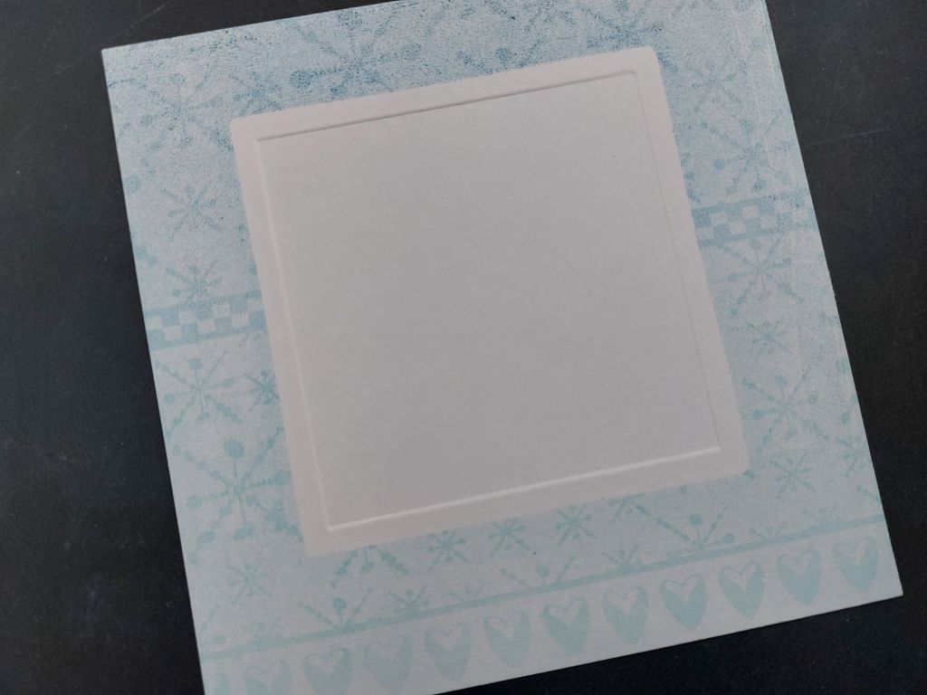 I cut the background down with the second largest nested square die (that’s the easiest way to get the exact piece you want, rather than trying to trim each side individually). I then turned to the smallest square embedder to emboss a frame into the central aperture.