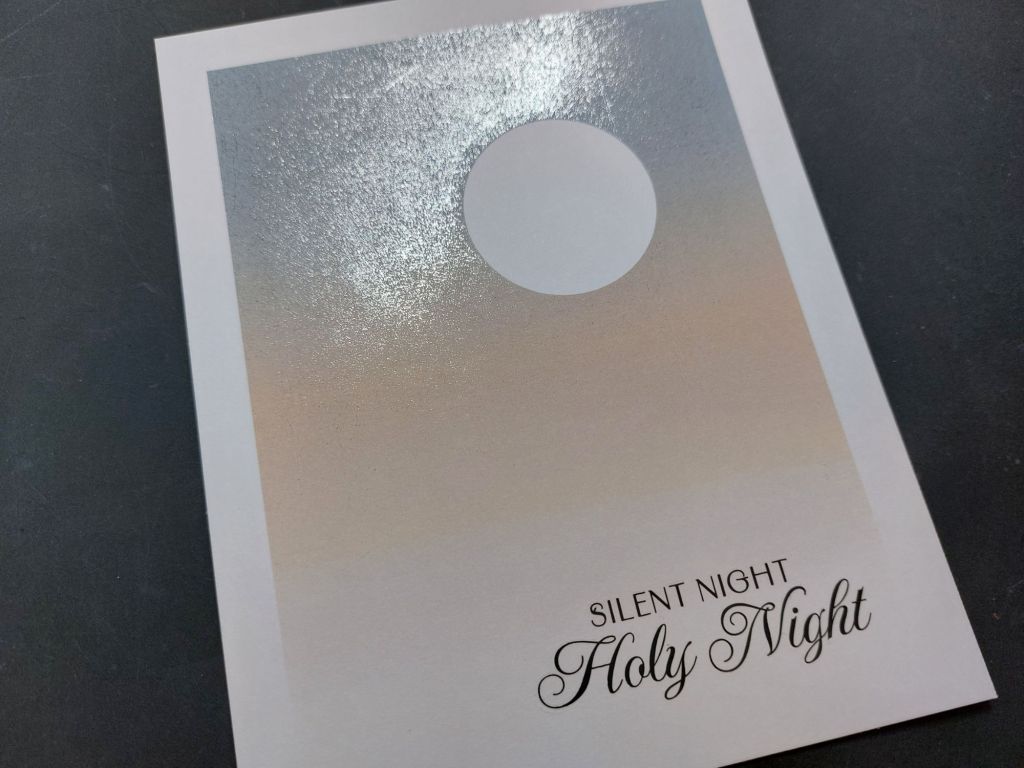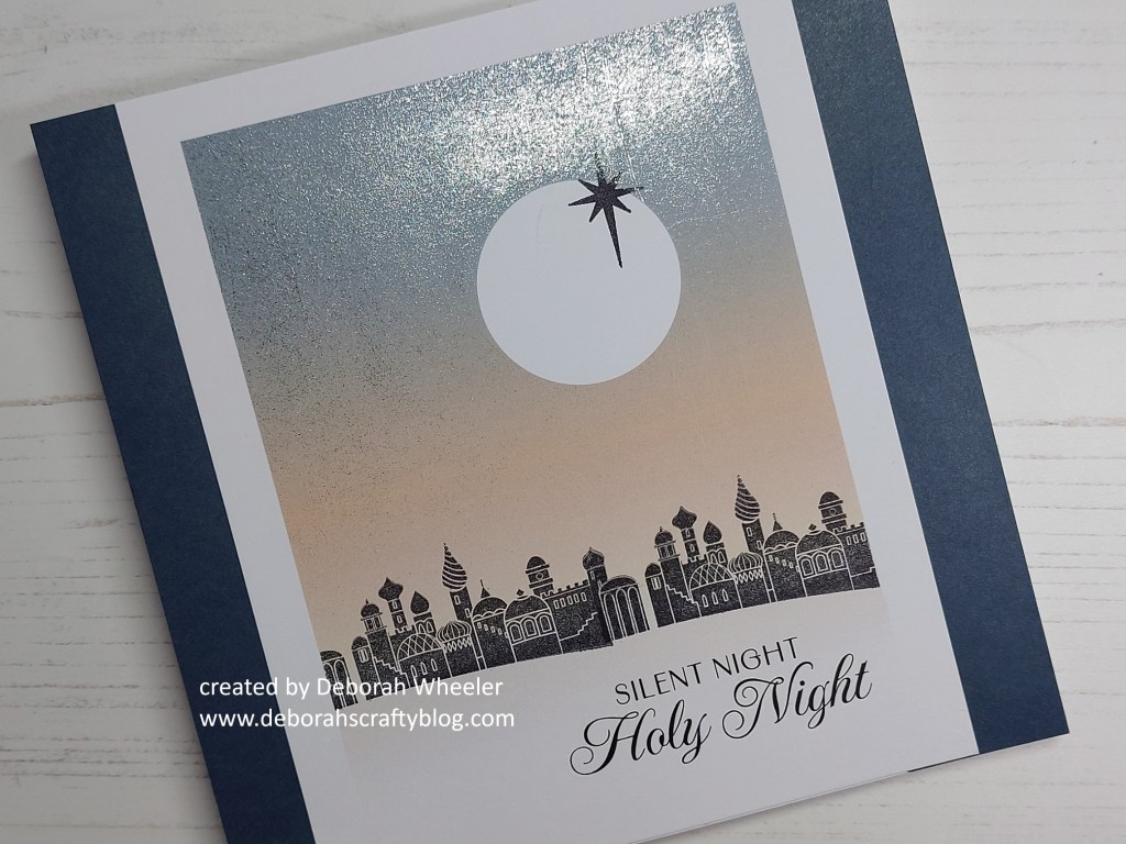 The first step was to hot foil the topper using the silver foil, which gives the most gorgeous sheen in the sky. I added one of the Christmas Rub-On sentiments across the bottom, which would then give me a guide for placing my Bethlehem scene as the background fades out at the bottom, rather than having a definite edge to it.