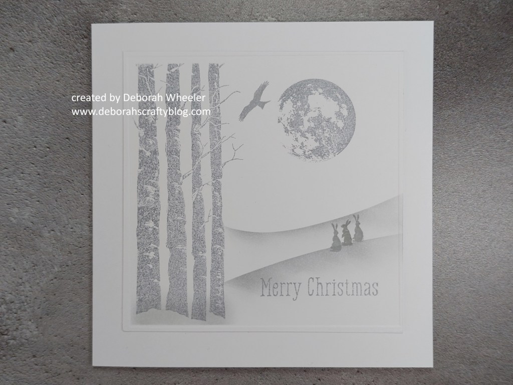 I didn’t do step by step photos for this, as It’s very straightforward. I cut a piece of card to fit a 6×6 blank and first stamped the tree trunks and the large moon from the set in ‘shadow grey’ Archival ink. I took one of the landscape masks, laid it in place and sponged more of the grey ink across it before moving it down the card to create a second piece of land. I added the bunnies (or hares?) sitting in the field checking out what’s around, plus the eagle in the sky and the sentiment across the bottom. After dragging a little more of the grey across a torn piece of copy paper to ground the trees, I used a square embedder to emboss an inner frame on the topper and simply attached it to the 6×6 card blank.
