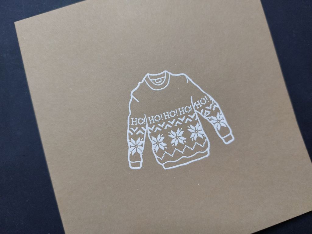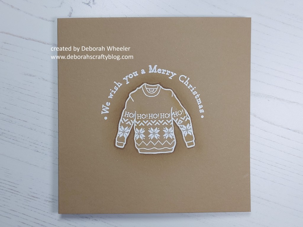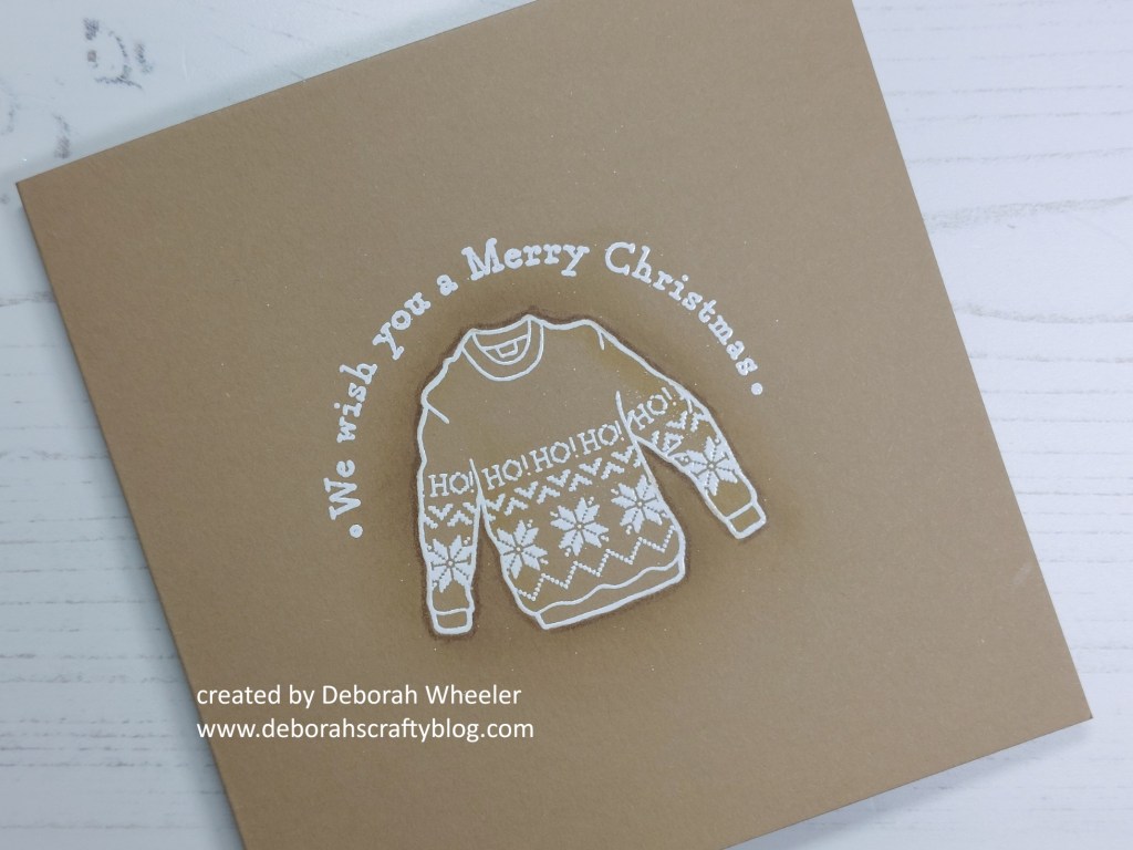 Starting with a 5×5 kraft card blank, I stamped one of the jumper outlines with Versamark clear ink and heat embossed it with WOW’s super fine bright white powder. The detail on these jumper patterns is fabulous and picks up the embossing beautifully.