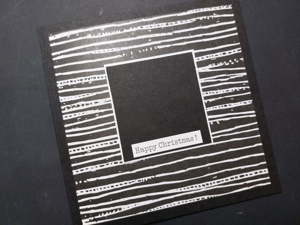 I took a black 5×5 card blank and added a piece of the striped BOW-WOB paper. Next was a small topper of black card with a narrow mount of white and one of the Christmas & Celebrations word stickers.