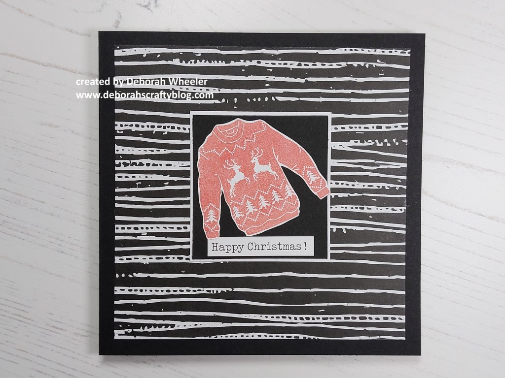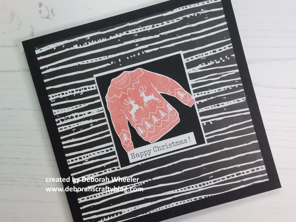 Hello everyone. I’m back with another look at the new Mini Christmas Jumpers stamps, the sales of which are raising money for Save the Children’s Christmas Jumper event. Today I’ve gone with one of the silhouette images (which also work as infill stamps for the outlines), teaming it up with a piece of striped BOW-WOB (black on white, white on black) paper from the original Set 1.