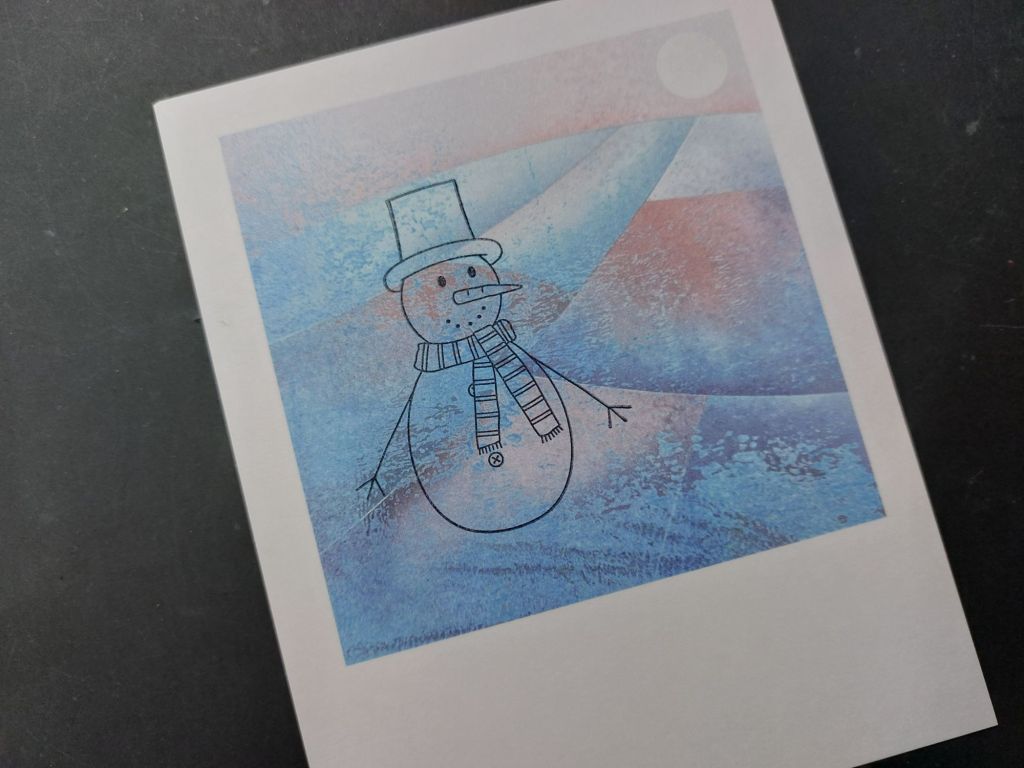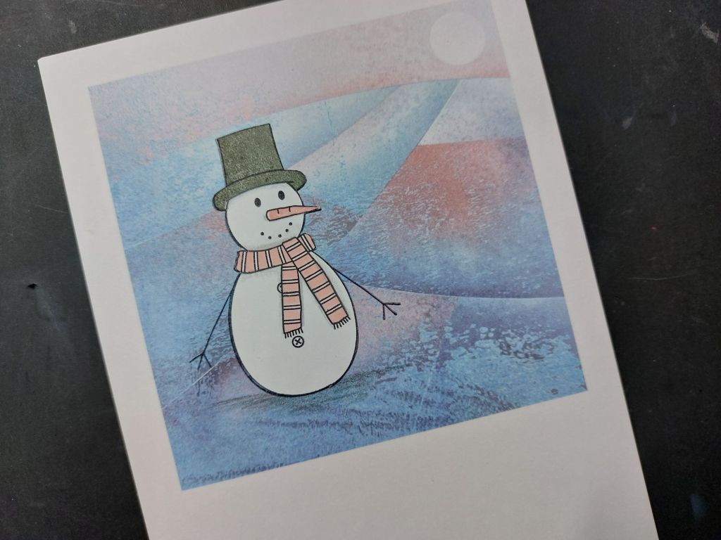 The first step was to find a suitable topper for my background – I then stamped the snowman onto it (that meant I had the placement decided and didn’t have to worry about his arms when cutting out his body!)