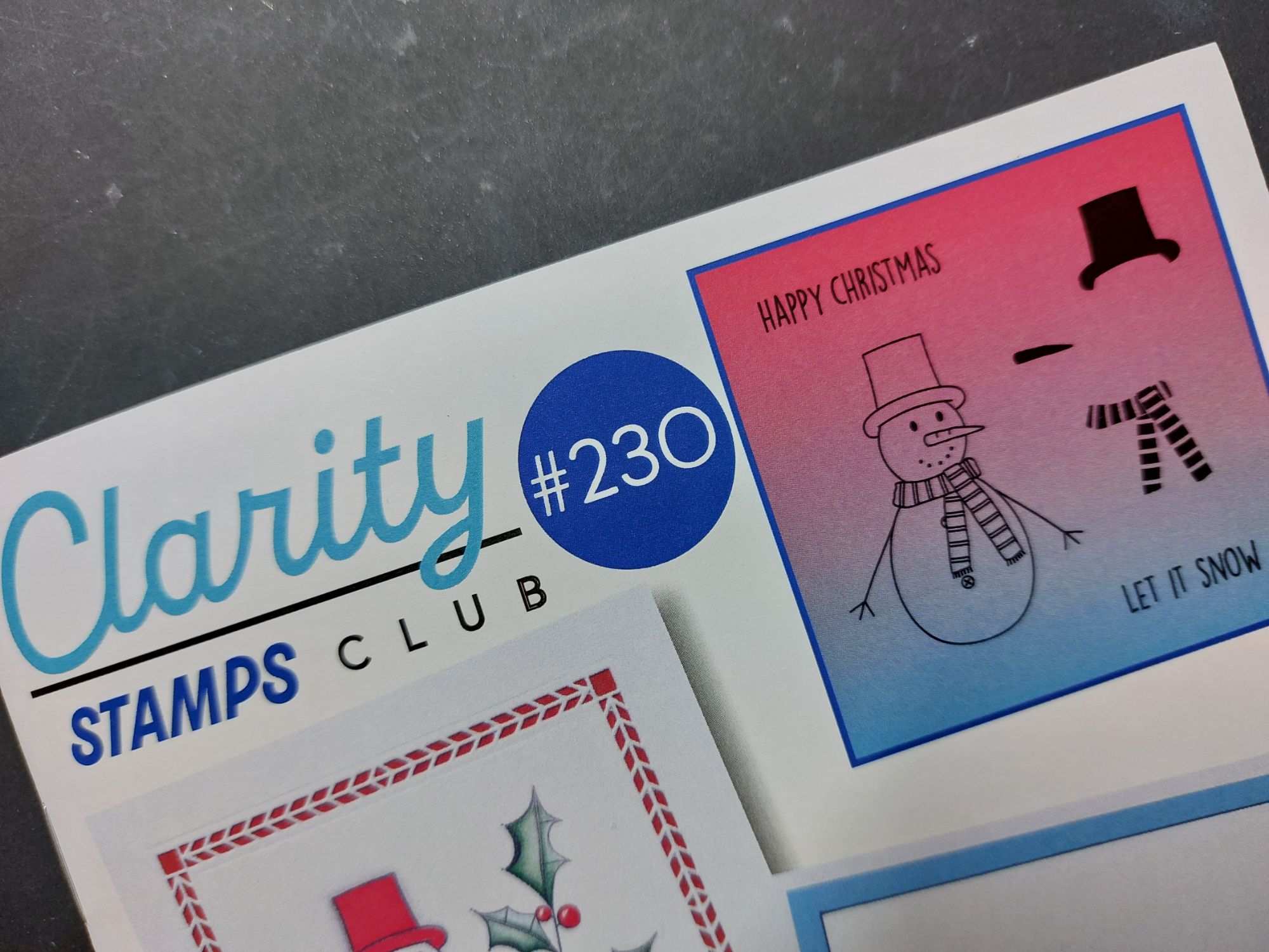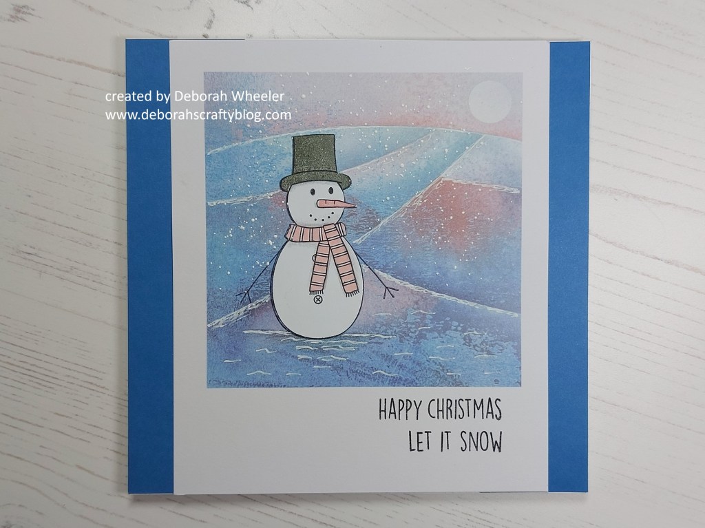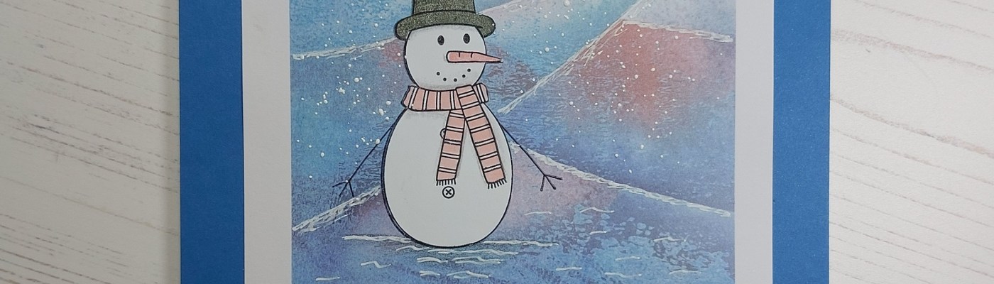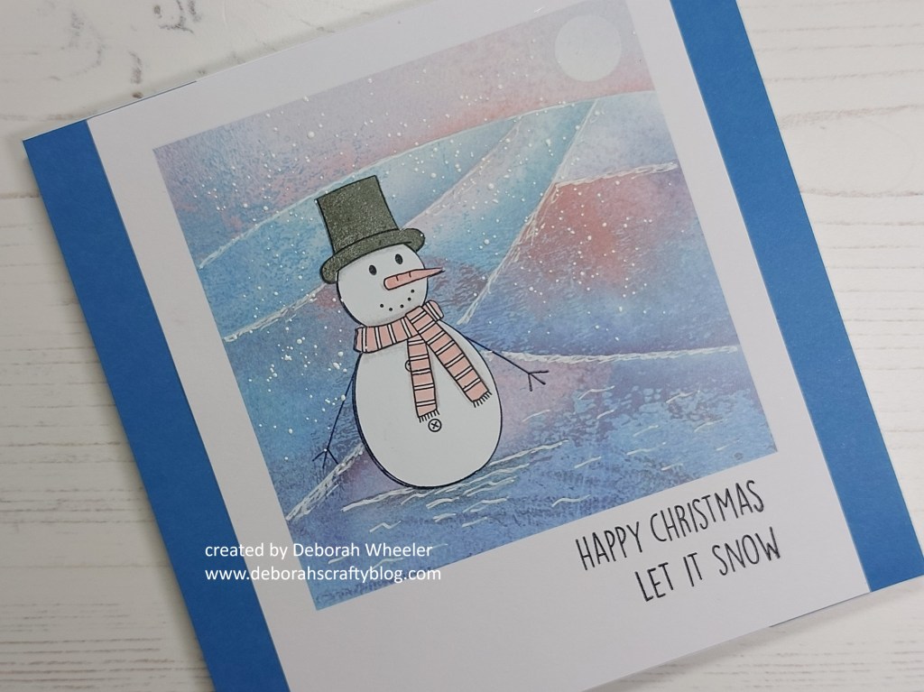 Hello everyone. It’s been a damp grey day here, so I thought I’d inject a bit of wintery atmosphere with the latest stamp from Clarity’s Craft Club the fab little ‘Let It Snowman’. I sat him in a chilly scene from the Landscapes by Barbara toppers set.