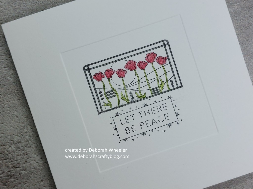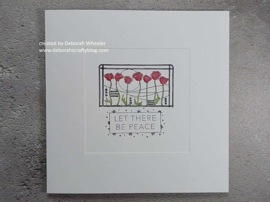 I started by embossing a square frame onto a 5×5 card blank using one of the pieces from the A4 square aperture mat stencil (it’s slightly smaller than the square embedders set) with a ball tool. I masked off the lower edge of the poppies stamp (the box where the sentiment would fit), inked it with black Archival and stamped it into the frame area. I could then add the small sentiment from the November Craft Club set below it.
