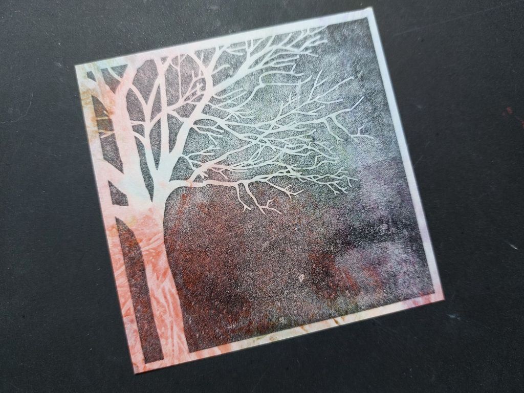 As you’ll have noticed from Sunday’s card, these stamps create the background, leaving the tree clear (hence the ‘aperture’ name). I wanted colour in my tree, however, so got round that by stamping onto a piece of the designer card. I inked up the larger of the two stamps with black Archival ink and planted it onto a piece of the card, which I then trimmed around the edges with my guillotine to give me an even border. Now, my stamping wasn’t the best – I was happy that I could still see some of the pattern through the ink, giving a hint of a landscape in the background, but less enamoured of the patch in the bottom right hand corner. Read on for my solution…