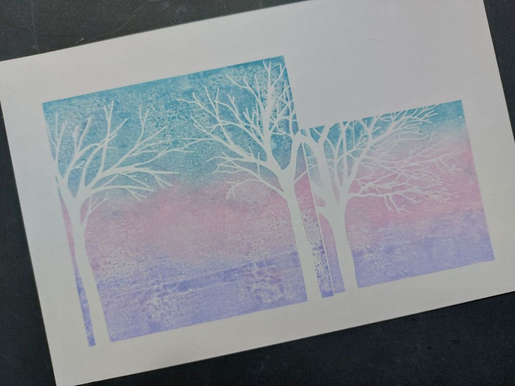 Hvaing cut a piece of card to fit on a 5×7 card blank, I sponged ‘broken china’, ‘kitsch flamingo’ & ‘shaded lilac’ Distress Oxides onto the larger of the two stamps in the ‘Travel Gently’ set, gave it a good spritz with water and planted it on the lefthand side of the card. I repeated the process with the smaller stamp from ‘All We Have Is Now’, trying to keep the colours in line with those one the first one.