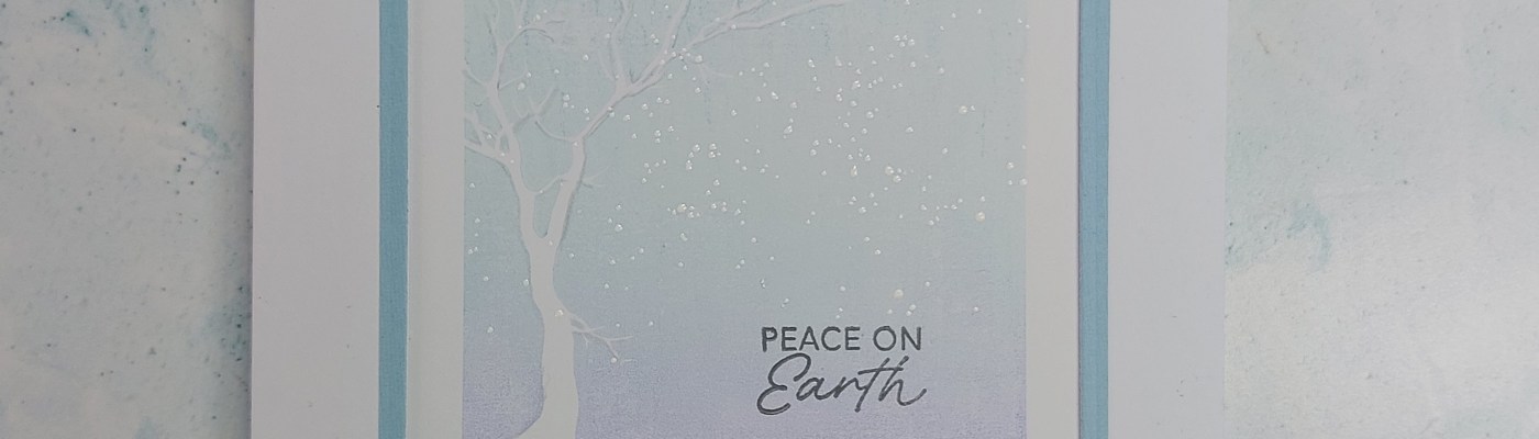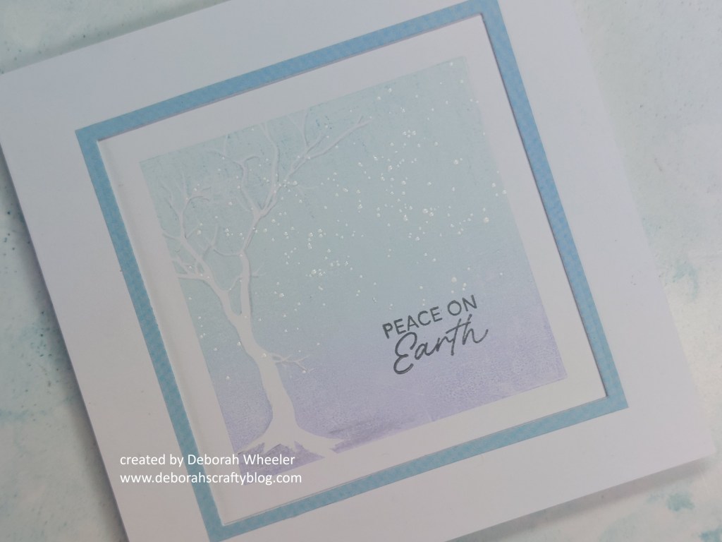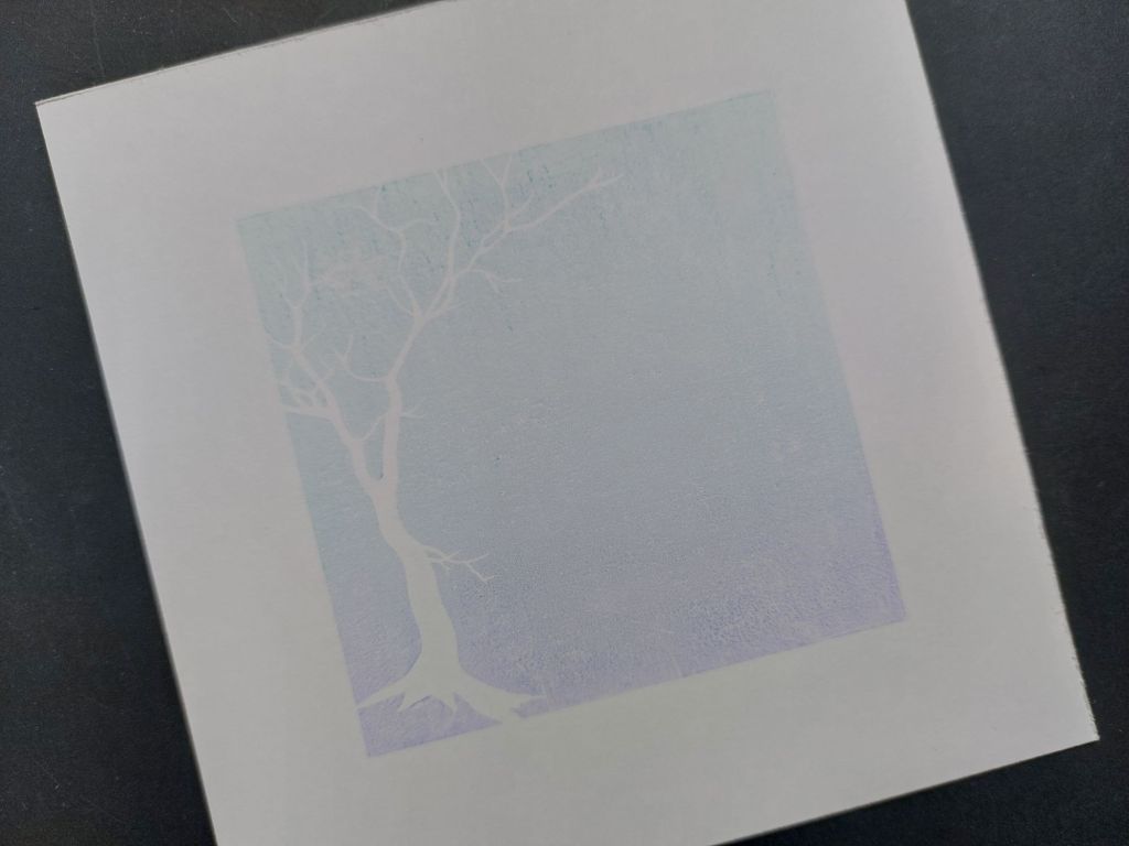 This time, I just used the smaller of the two stamps in the set, brayered it with ‘tumbled glass’ and ‘shaded lilac’ Distress Oxides and stamped it onto a 3.5″ square of stencil card. The details on these stamps is so fine, the tree branches show up really well even with pale inks.