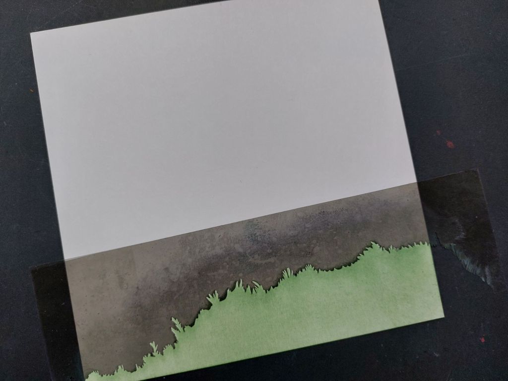 Having cut a piece of card to fit on an A6 card blank, I laid the grass area across the bottom and brushed ‘rustic wilderness’ Distress Oxide across it, using a sponge to drag ink down from the mask to sharpen the image (I love the detail on this mask)