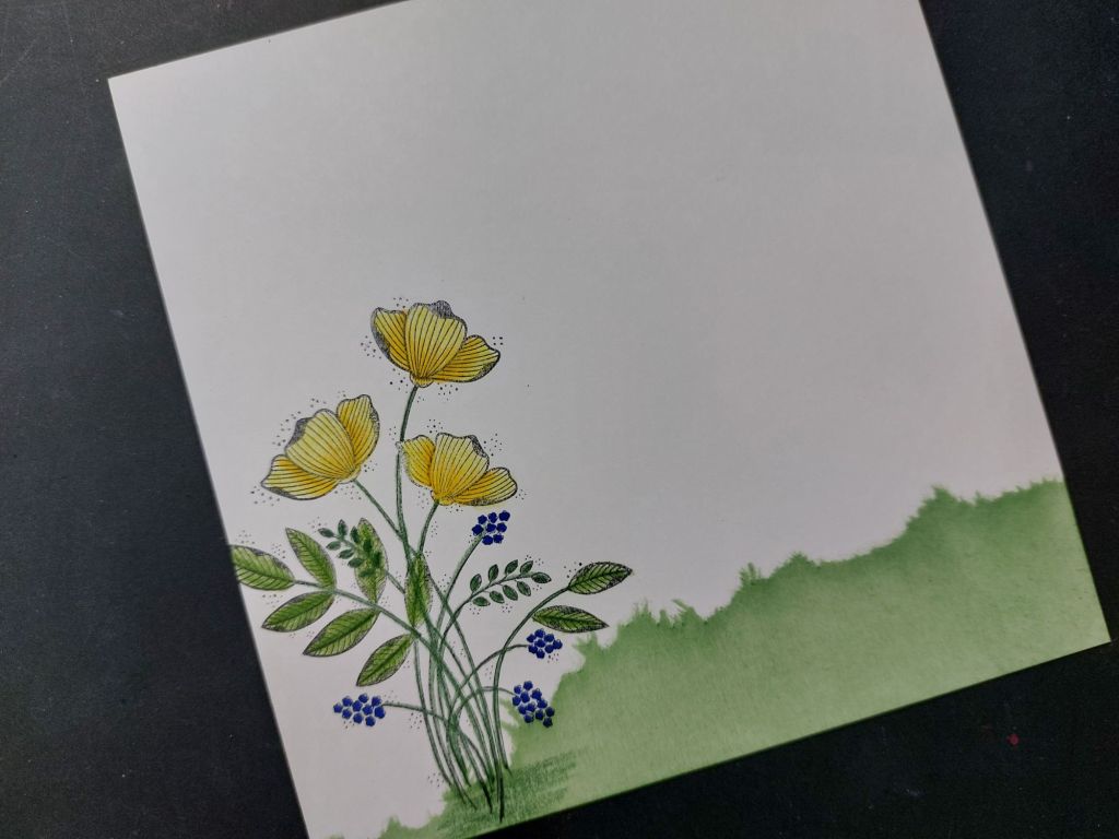 I stamped the floral spray to the side using black Archival ink, then shaded it with yellow & green Polychromo pencils for a spring look, dotting the little flower sprigs with a dark blue Pergacolour pen.
