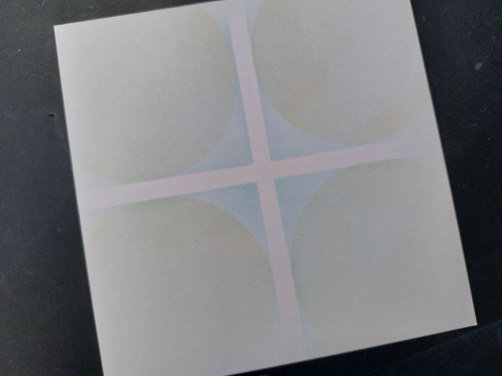 I worked on a 5×5 piece of stencil card, laying the square framework stencil over it first – as the stencil is larger than the card, I taped it to a piece of copy paper that I’d sat the stencil card on. I could then brush ‘tumbled glass’ Distress Oxide through it, before swapping to the circle stencil and repeating the process with ‘antique linen’ Oxide.