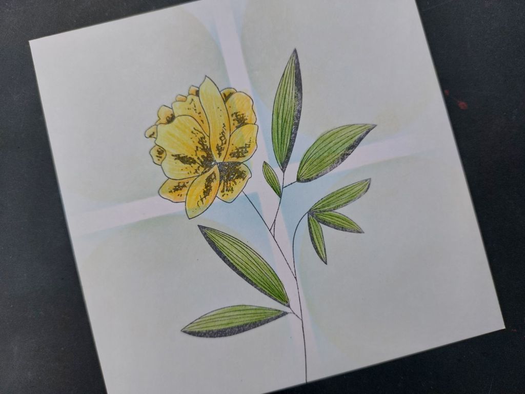 I stamped one of the Big Blooms onto the card and then shaded it with Polychromo pencils, using ‘dark cadmium yellow’ and ‘cadmium orange’ for the flower, and ‘earth green yellowish’ and ‘permanent green olive’ for the leaves.