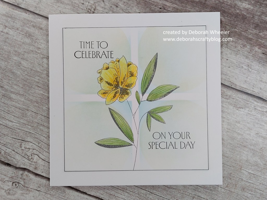 Hello everyone. I’ve got another card to share using some of the recent new goodies from Clarity. I’m always saying I need to make better use of my stencil stash (I have been making an effort recently!) so I decided to put of the new large framework stencils (squares and circles) into action on this card. They made a great background for the Big Blooms – Stripey Flowers too.