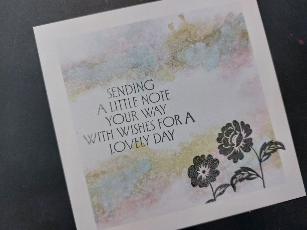 I chose one of the toppers and cut it square, then ran low tack tape along the lower edge of the printed image. I could then stamp two of the flowers from the set with ‘watering can’ Archival ink together with one of the sentiments.