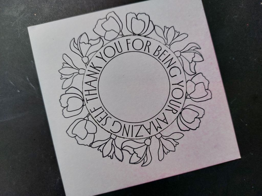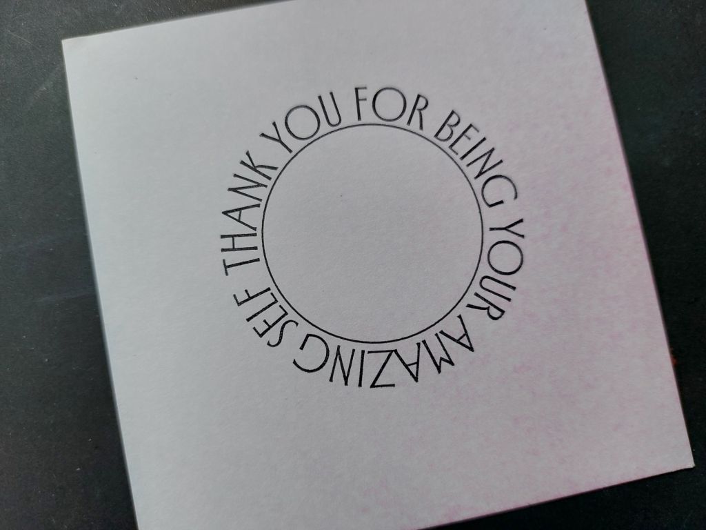 I started with a 3.5″ square of stencil card that I’d used to clean pink ink from a brayer and stamped one of the circle sentiments onto it with black Archival ink.