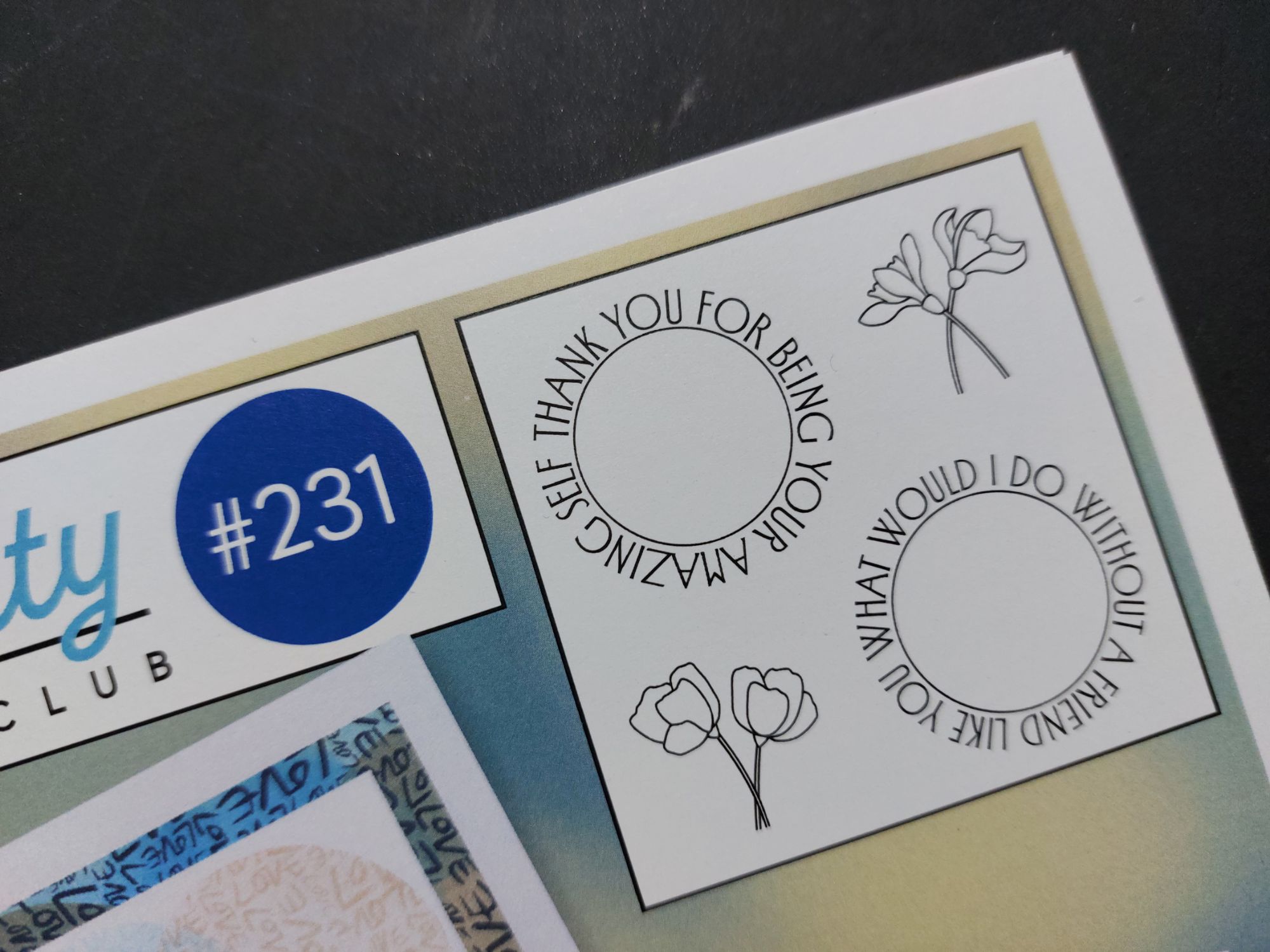 I found a circle mask the right size in my folder (I think I cut it from blank mask material with a nested die), covered the centre of the image and then worked around the mask stamping the two little sets of flowers from the club set, alternating them as I went. Unfortunately, I’d misjudged the circle and didn’t have enough space to stamp the final pair in, so I masked off one of the flowers with low tack tape before inking it and then added a single image to fill the gap. I also went gently around the edge of the circle mask with a micron pen before removing it, which anchored the flowers around the sentiment.