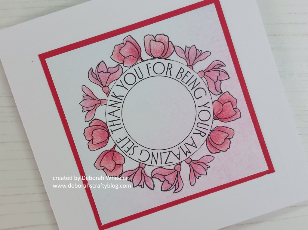Don’t you think this little wreath of flowers is just so pretty? I took the pink tones from the palette at Color Dare and the focal sentiment works well for the Word Power challenge.