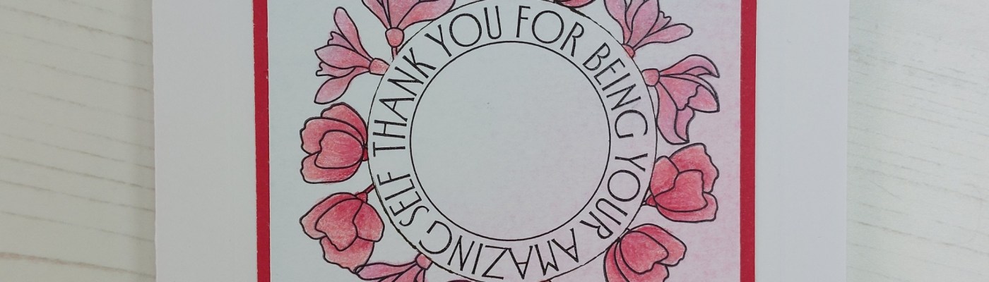 I shaded in the flowers with pink & red Polychromo pencils, using different tones for the two images, then added a mount of companion paper and attached it to a 5×5 card blank.