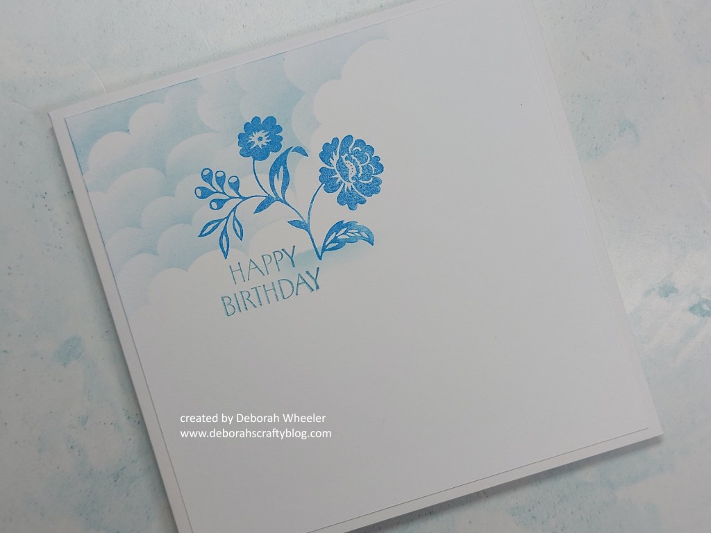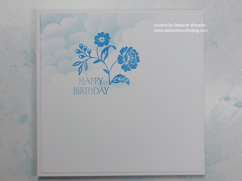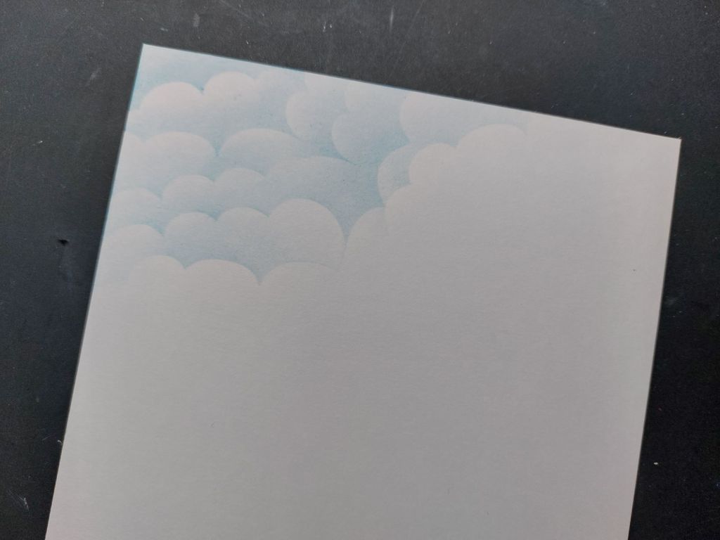 I first cut a piece of stencil card slightly smaller than my 6×6 card blank, then brushed ‘tumbled glass’ Distress Oxide across the clouds mask to pick up the corner triangle in Nancy’s sketch. I find the trick when using the mask is to brush the ink upwards from it (working from the top down), giving you the effect of the white clouds, and to move the mask left and right on the card to offset the images – you never get clouds in regular striped lines, do you?