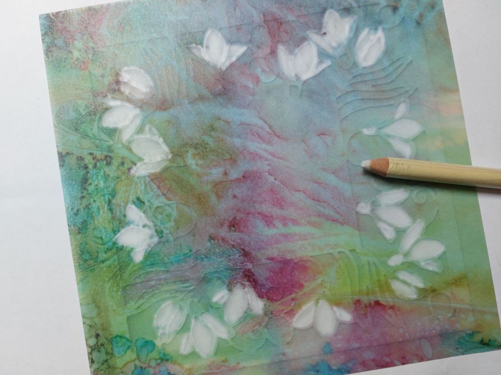I glued it onto a piece of Toscana designer parchment with Perga glue (which is specifically designed to use with parchment), making sure it was on the muted front side, not the brighter side, which is where the ink is printed. I then set about rubbing the ink off the back of the parchment through the snowdrops on the die, to whiten it. Flipping the parchment to the front, I sharpened the white snowdrops by shading them with a Pergamano pencil.