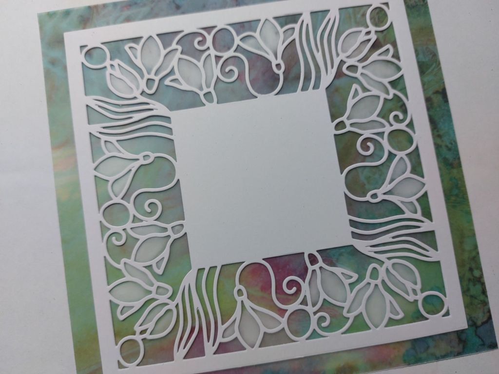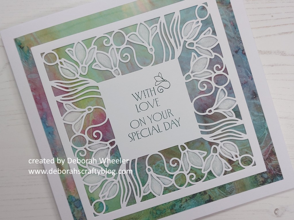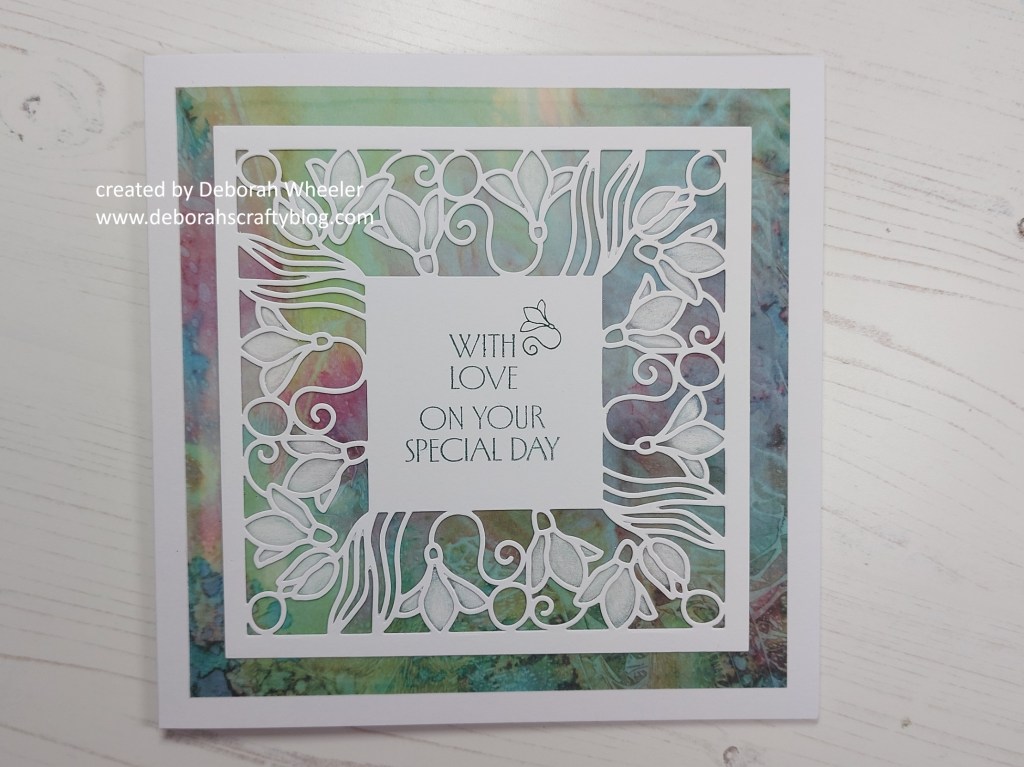 Hello everyone. Had a busy day up at Clarity Crafts today with the live demos on their YouTube channel and wanted to share one of the demos from this afternoon’s show. It’s actually also my DT card for the new theme of Texture at Alphabet Challenge and I’m a bit late posting it, but didn’t want it to go live until after the show! I’ve used the lovely Snowdrops square aperture die with some designer parchment – gluing the die onto the parchment gives it the texture we’re looking for at Alphabet.