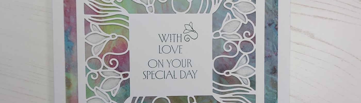 Hello everyone. Had a busy day up at Clarity Crafts today with the live demos on their YouTube channel and wanted to share one of the demos from this afternoon’s show. It’s actually also my DT card for the new theme of Texture at Alphabet Challenge and I’m a bit late posting it, but didn’t want it to go live until after the show! I’ve used the lovely Snowdrops square aperture die with some designer parchment – gluing the die onto the parchment gives it the texture we’re looking for at Alphabet.