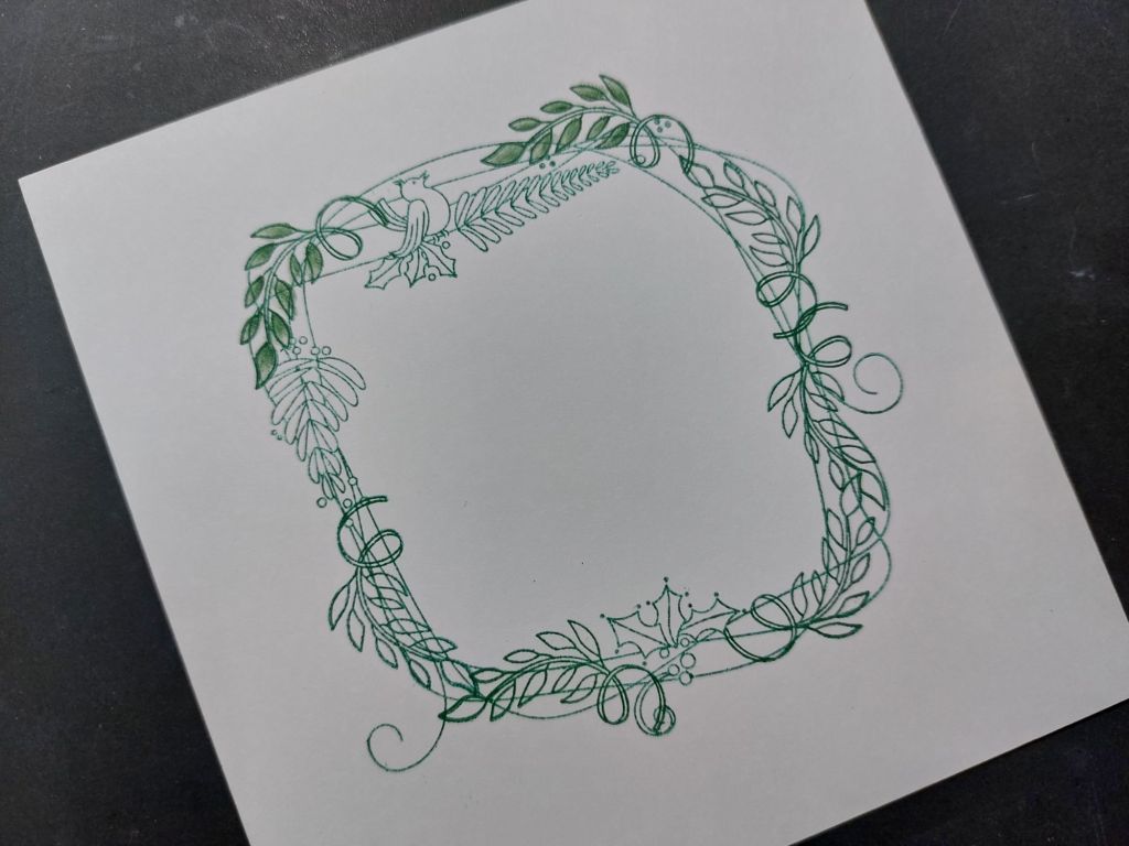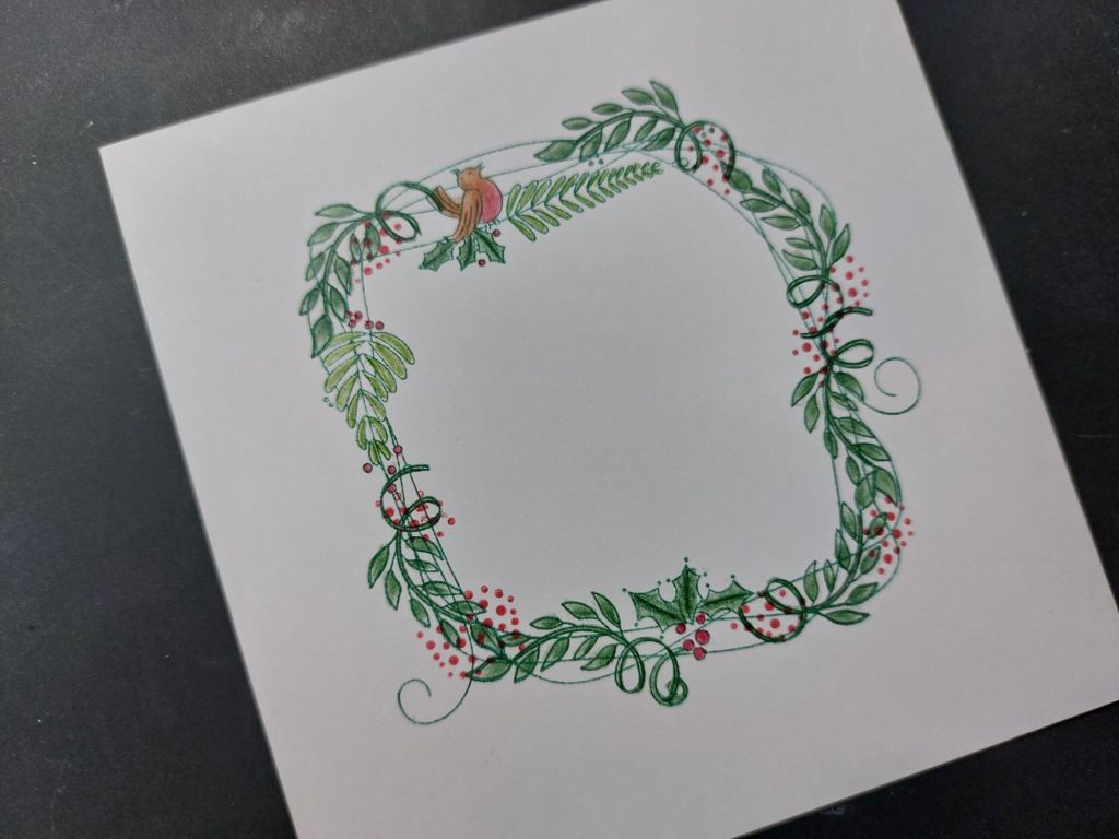 Starting with a 4.5″ square of stencil card I stamped the wreath outline in ‘library green’ Archival ink, then added one of the leafy accent stamps from the set around the frame to fill it in. I shaded the images with red & green Polychromo pencils before plating a few more berries around them with the little dotty stamp and ‘red geranium’ Archival ink.
