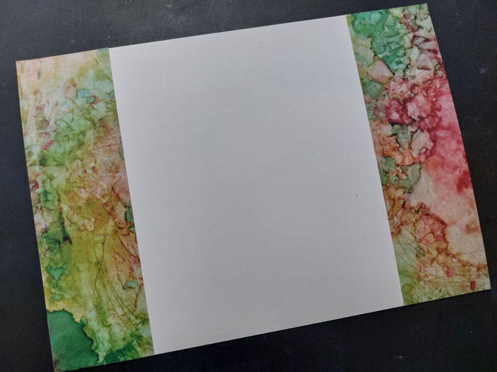 Turning to the base, I cut a 5×7″ piece of white card and simple glued a couple of strips of Amazonia designer paper, one on each side. Paul pointed out of the show that you could also do this one one of the designer card toppers, but I was trying to use up scraps from my folder (plus you’d waste a load of the designer card underneath the base where you couldn’t see it!)