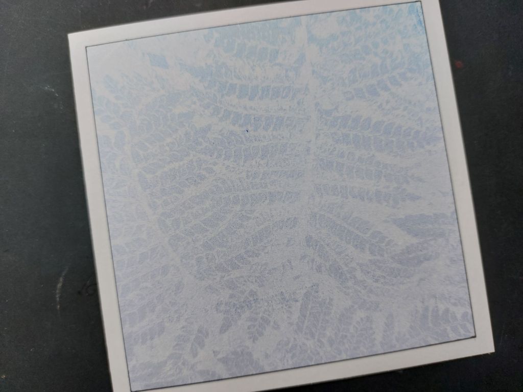 I decided to put both the papers and stamp into action for this first play and started by brayering ‘chipped sapphire’, ‘blueprint sketch’ and ‘salty ocean’ Distress Oxides horizontally onto my 6×6 gel press. I found the piece of the BOW-WOB paper that matched the image on the stamp, then laid it face down on the gel press and rubbed it very lightly. When I lifted the paper off, not only was it coloured, but I had the design left on my gel press plate (the black ink on the paper acts as a resist to the ink on the gel press). I then pulled a print from the gel press onto a 7×7 piece of stencil card. Two backgrounds from one process!