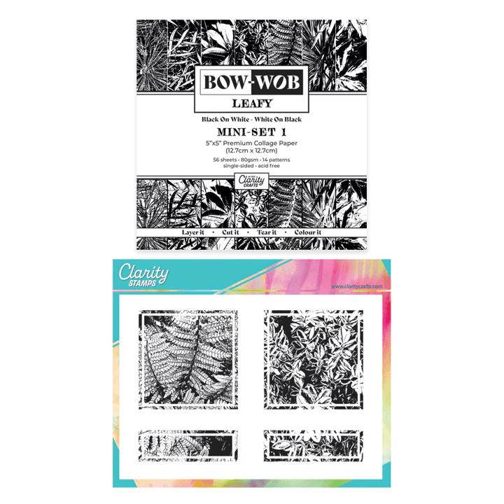 Hello everyone. It’s been a very grey and miserable day here in North East London, so the best plan this afternoon was to stay indoors and craft! When I was over at Clarity Towers on Friday for my shows, I got my hands on a early set of stamps and mini BOW-WOB papers that Barbara will be launching on Clarity Social TV tomorrow afternoon (Monday) – meet the new Bijou Leafy Backdrops