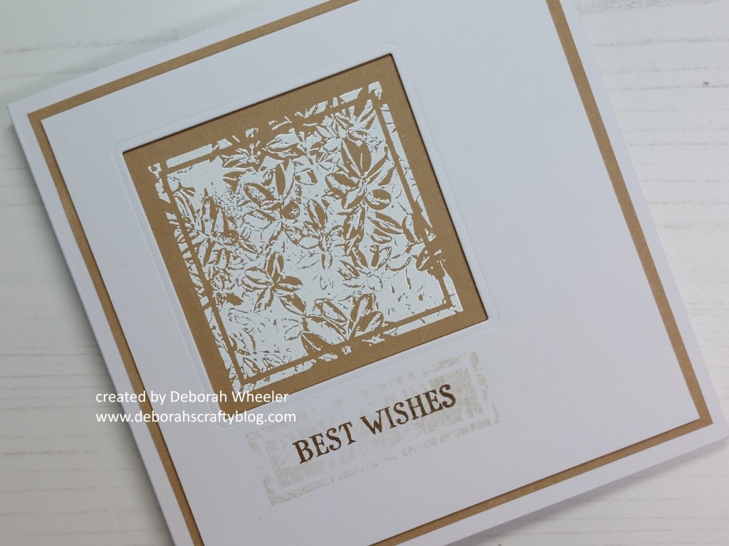 Next was to cut a topper to fit a 5×5 card blank, then create an aperture in it with a nested square die. I layered scrap card onto the back of the topper, then ran glue around the edge of the aperture and laid it over the embossed image, so it sat squarely in the window.