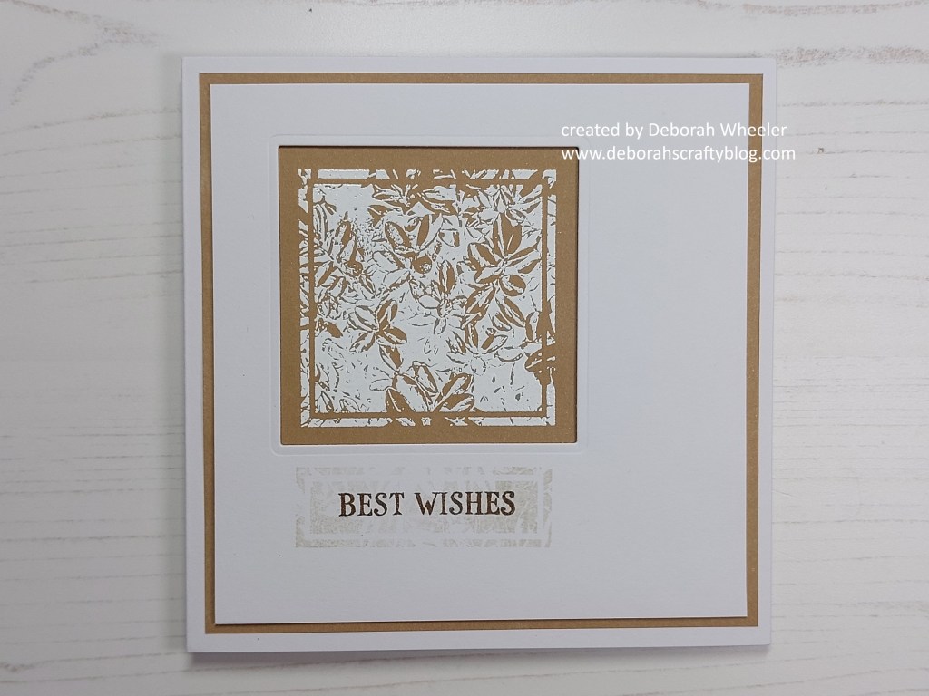 I popped another piece of the buff paper onto the front of a 5×5 card blank, then added the topper onto it. I finished by stamping the smaller backdrop stamp below the aperture using ‘pumice stone’ Distress Oxide and added one of the Bijou Retro Sentiments in ‘potting soil’ Archival. With hindsight, I could have used a slightly darker ink for the sentiment background, but hey ho…