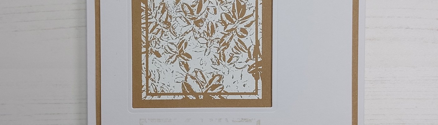 Next was to cut a topper to fit a 5×5 card blank, then create an aperture in it with a nested square die. I layered scrap card onto the back of the topper, then ran glue around the edge of the aperture and laid it over the embossed image, so it sat squarely in the window.