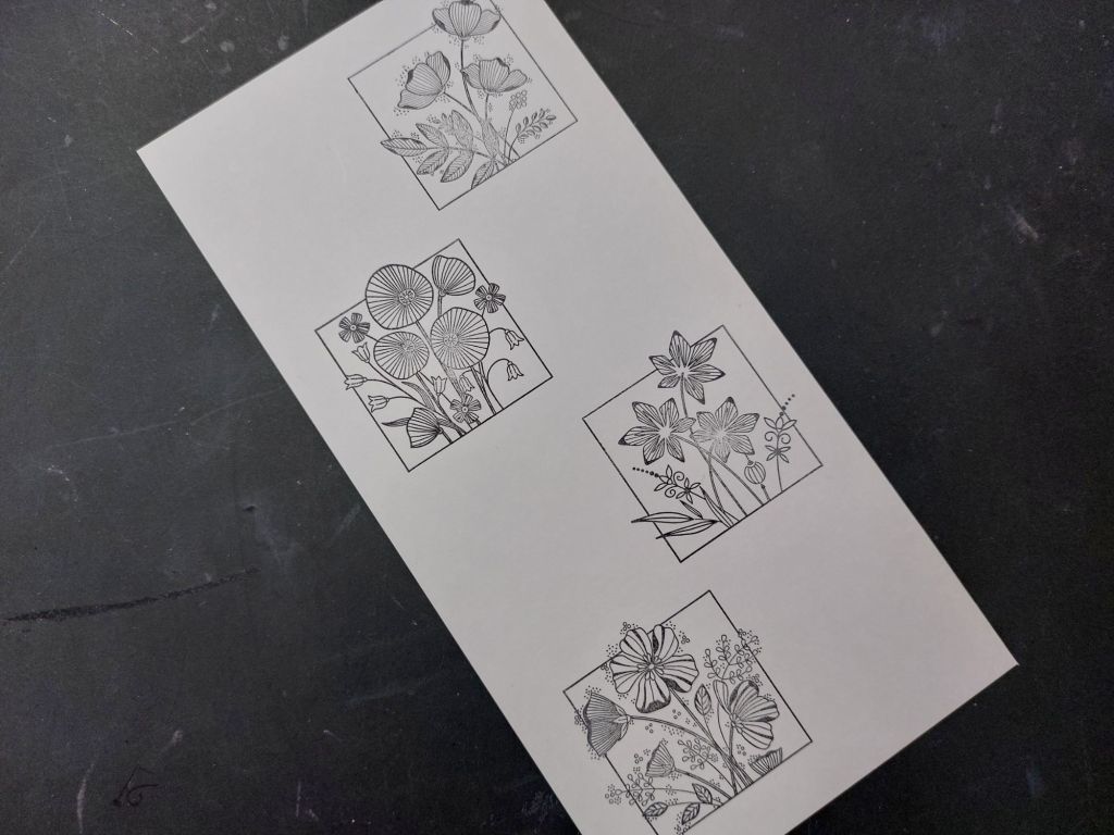 I started with one of Clarity’s 8×8 card blanks and cut it in half with my guillotine, keeping the fold at the top, then cut a piece of stencil card for the topper. Onto that I stamped four of the sampler images – I positioned the top and bottom ones first, then could make sure that the middle ones were equally spaced. It was then time for a happy few minutes shading them with Polychromo pencils, using various combinations of ‘madder’, rose carmine’ and ‘pink madder lake’ on the flowers, plus ‘warm grey II’ and ‘nougat’ on the leaves and stems – I do like the soft combination of the pink & brown.