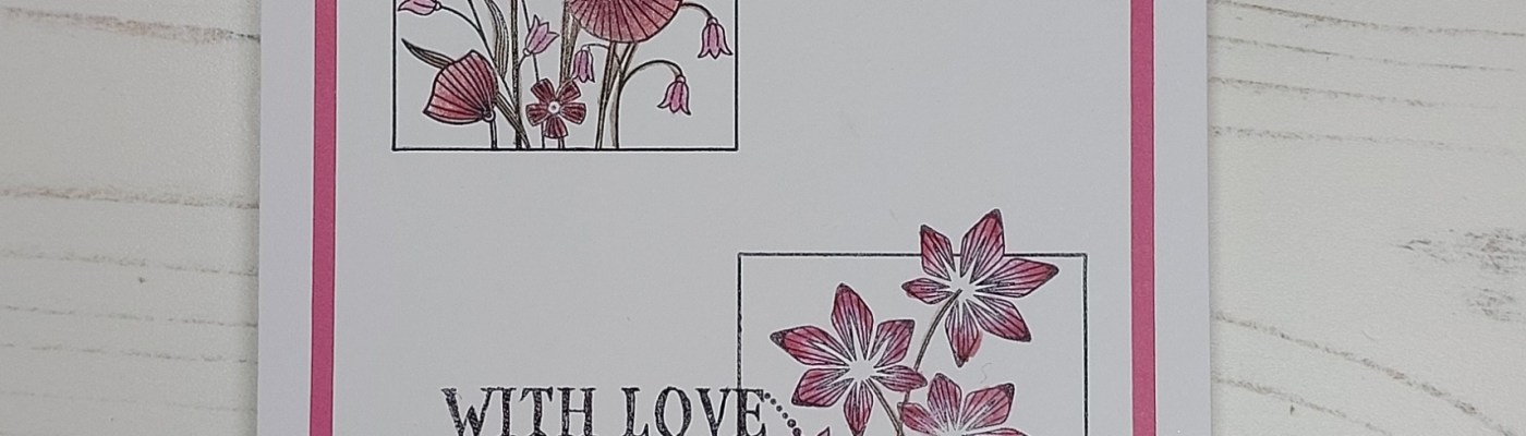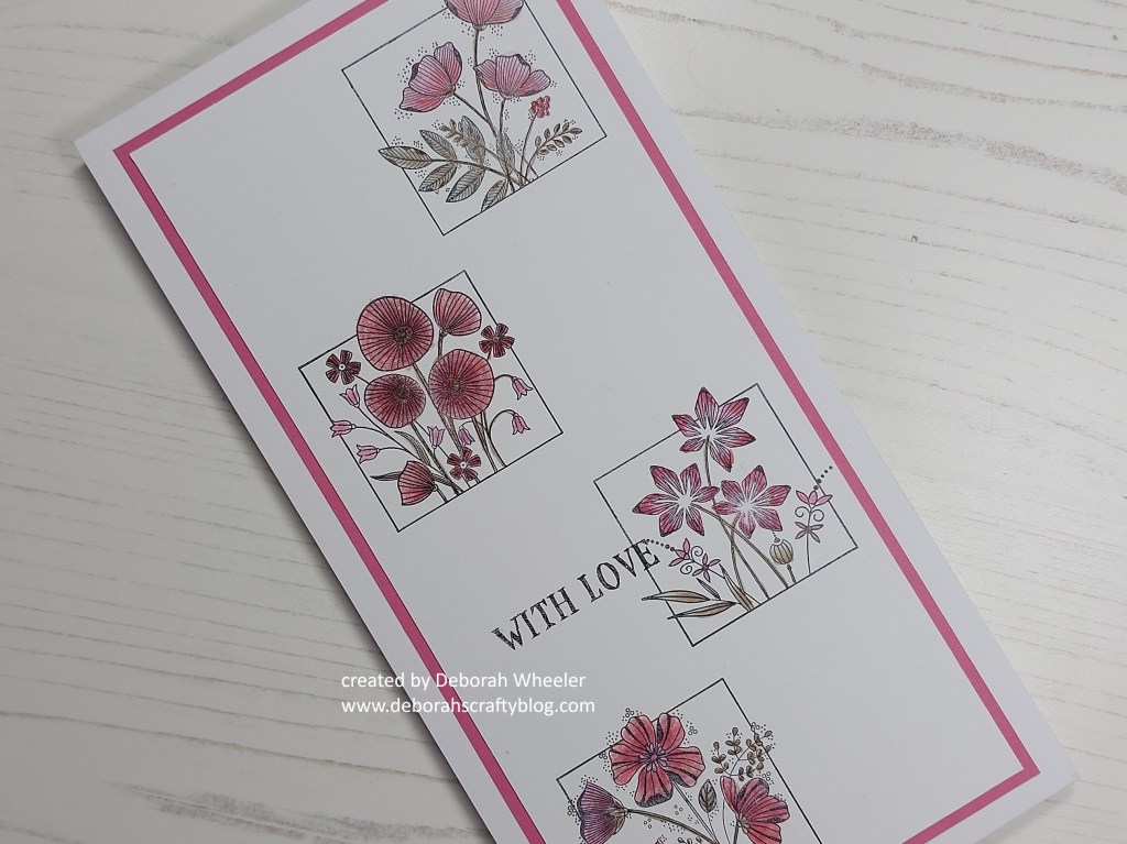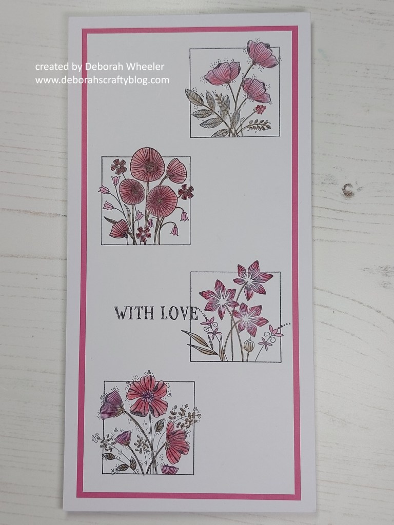 Hello friends. I finally managed to grab a bit of time to play with the new Floral Spray Sampler stamps from Clarity and just went for pink tones on these lovely images (bit of a switch from yesterday’s offering!) I took the opportunity to showcase several of the images by putting them on a slimline card – so easy for these square shapes.