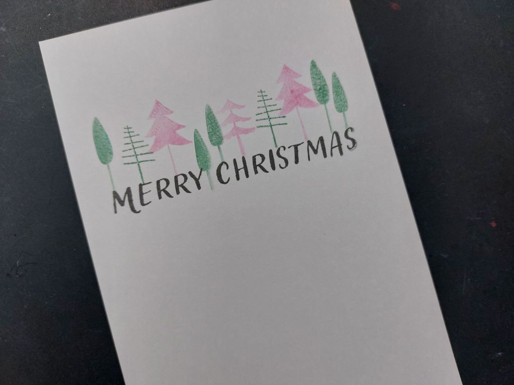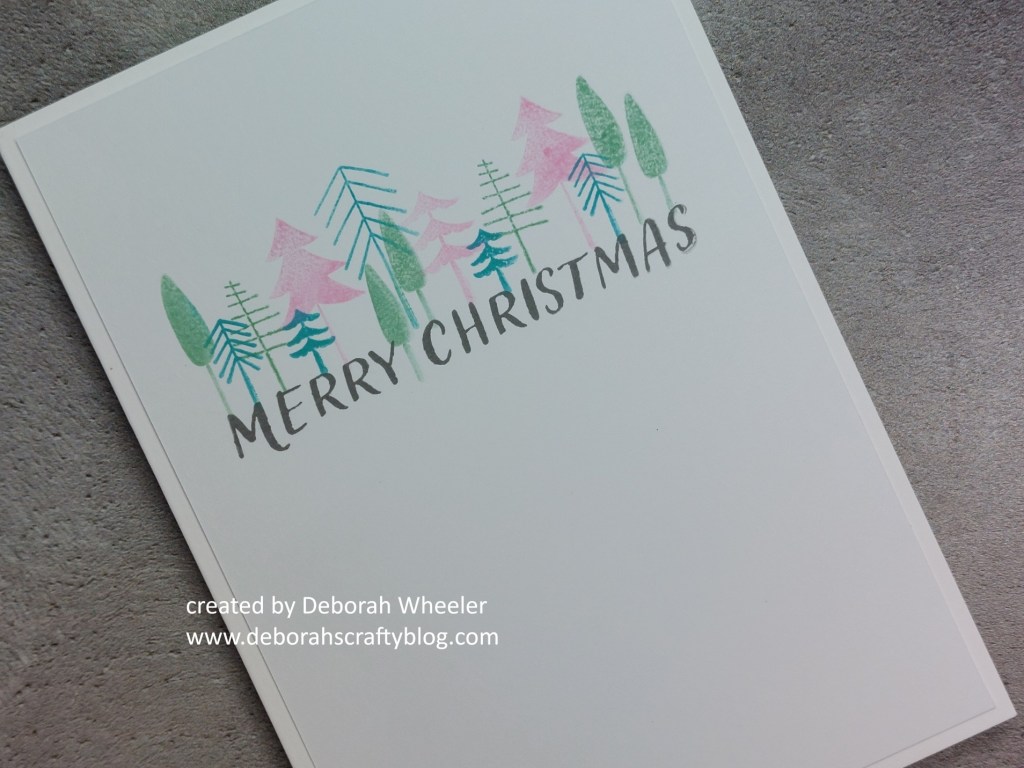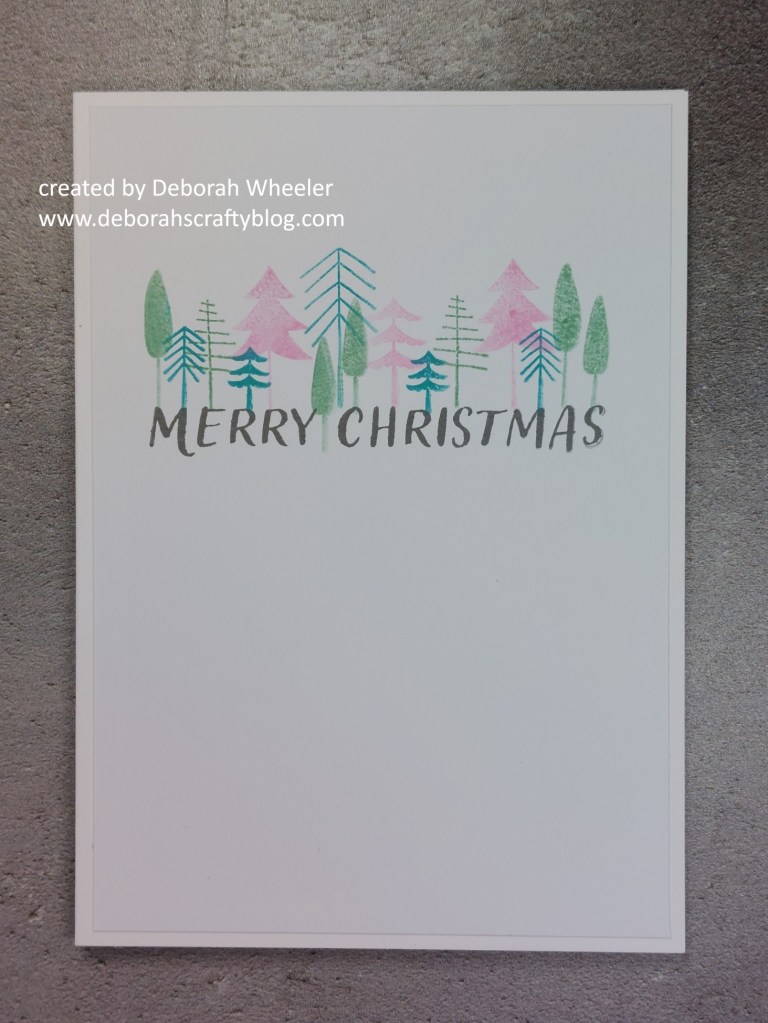 For this one, I cut a piece of card to fit on an A6 card blank and stamped the sentiment across it with ‘watering can’ Archival ink. I sat a little forest of trees across the top of it, using ‘evergreen bough’ and ‘kitsch flamingo’ Distress Oxides.