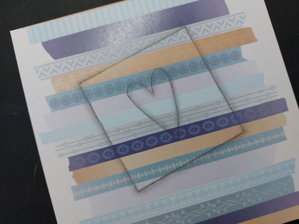 The designs Barb did in the SHAC were one layer pieces, with the illusion of the white card created with masking. Although I was using a card topper, I wanted to mimic the effect, so positioned the heart aperture on the fabric strips card and drew around it with a pencil (both the outer and inner edges). I then used grey Polychromos to created a drop shadow around the outline.