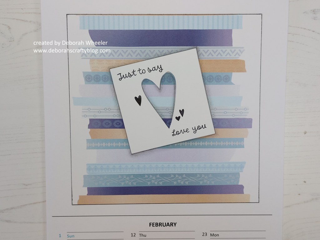 I used the stamps from the Whole Lot of Love set to decorate the topper and attached it to the printed card. Having edged that piece with a black Sharpie it glued it into place on my calendar.