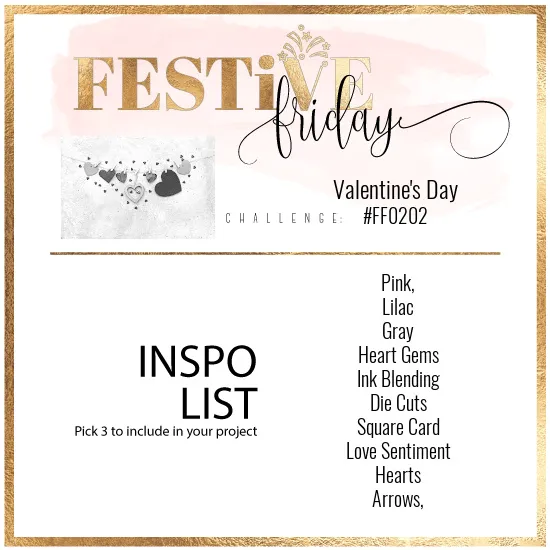So I’m set for the next month now and need to start planning my March page… These Products of the Month are brilliant, and the even better news is that if you put any of them in your shopping basket over the month, then you get double loyalty points on your whole basket – that’s definitely a Whole Lot of Love! And this is the perfect opportunity to share the love on this page a little more widely with a couple of current challenges. Festive Friday are celebrating Valentine’s Day and I picked up lilac, square card, love sentiment and hearts from their inspo list. Love is also in the air at The Paper Players.