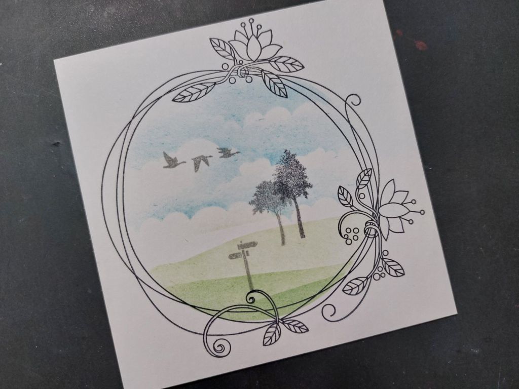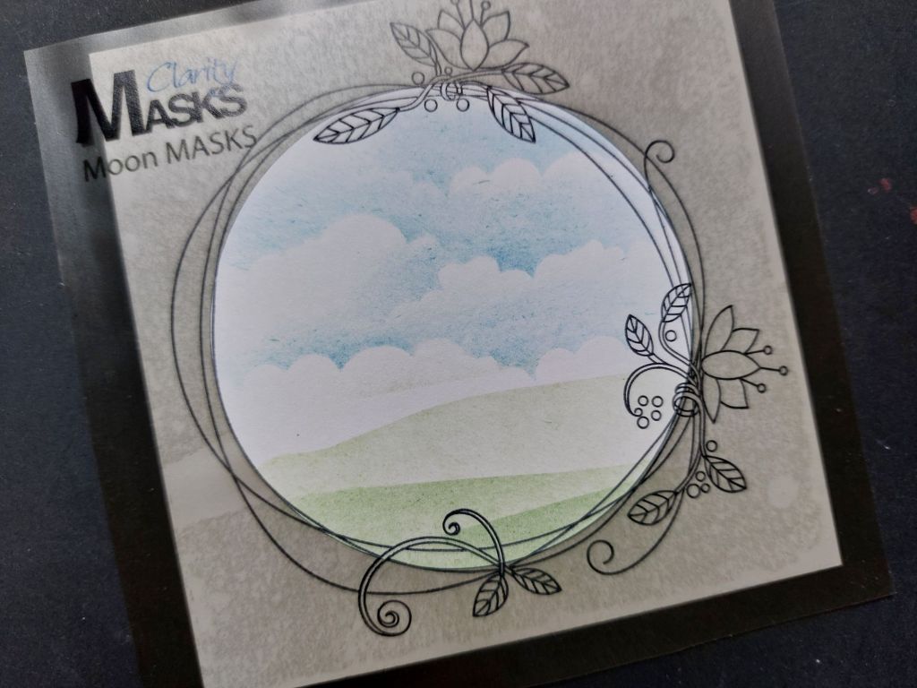 Having stamped the entwined wreath onto a piece of Clarity’s 3.5″ stencil card, I covered it with the outer part of the largest moon mask, which was roughly the right size. I could then use the small clouds strip from the Build a Scene masks to create my sky, lightly brushing ‘broken china’ Distress Oxide upwards from the mask and repositioning it as I went so I didn’t get stripes across the sky. I switched to one of the landscape strips to brush ‘mowed lawn’ across it for the land.