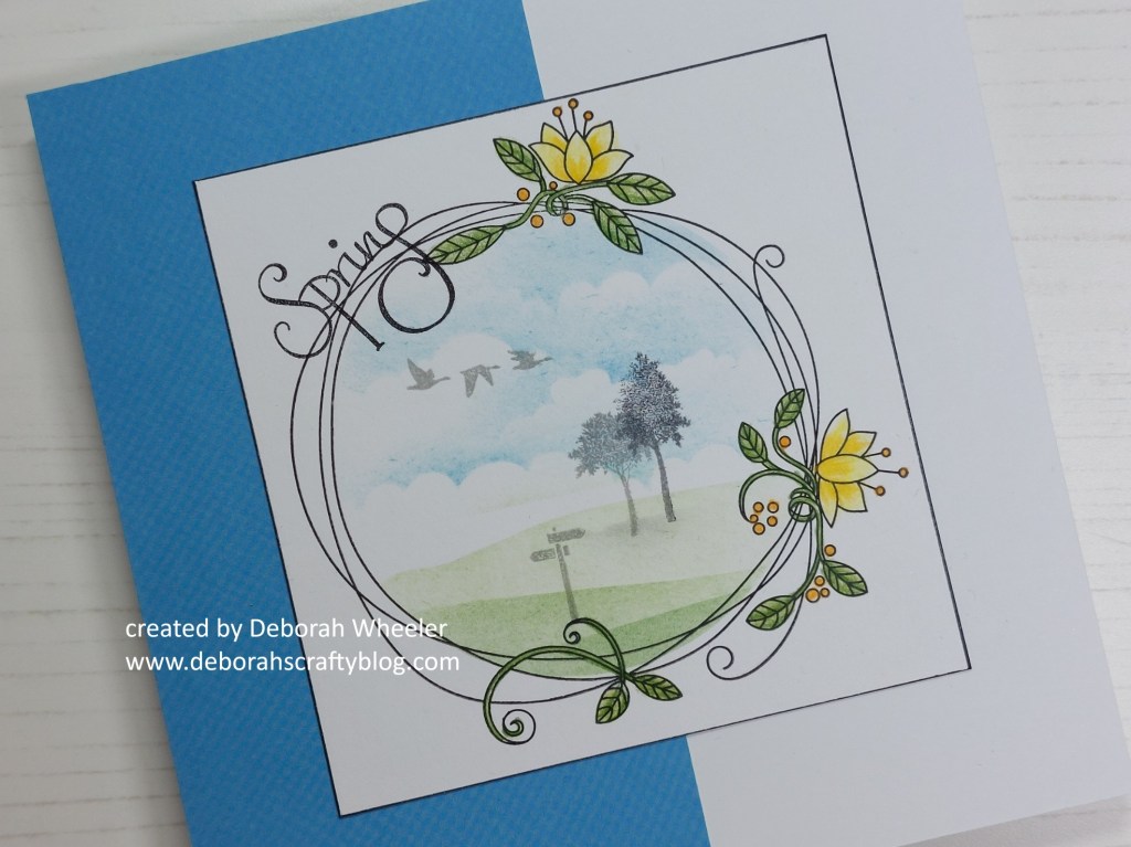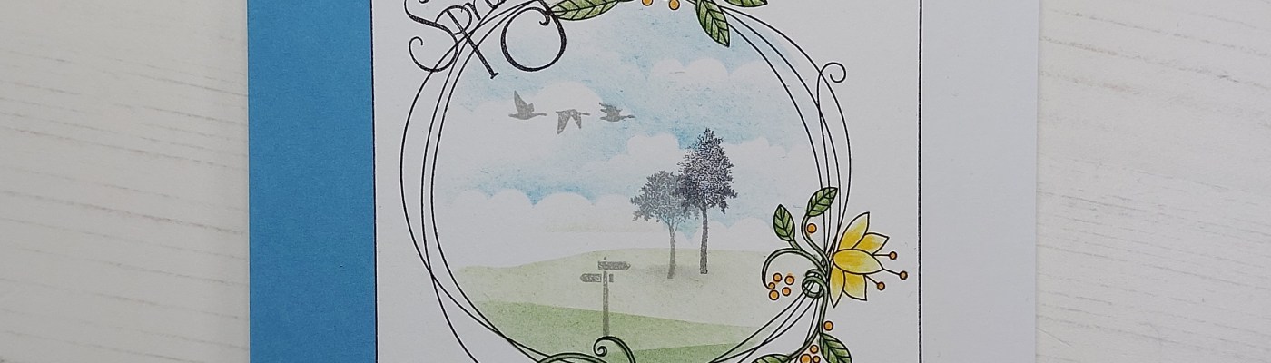 Hello crafty friends. I’m back today to share one of the cards I demo’d on Clarity Social TV last month using the Bijou Entwined Spring Wreath stamp set. These are such pretty stamps and I decided that the frame would work perfectly for a little spring scene.
