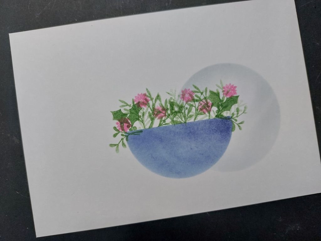 I ran low tack tape across the rim of what was now a blue bowl, and then set about filling it with plants from the Winter Build a Wreath set using ‘rustic wilderness’ Distress Oxide. I then added in a few of the small poinsettia using ‘kitsch flamingo’.
