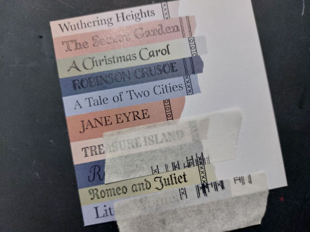 The first step was to cut one of the plain card strips pieces into four, then took one of the quarters and stamped the book titles onto it using black Archival Ink and working down from the top. The set also includes several little decorative strips as you would find on the spine of a book, so I added one of them to each ‘book’, using low tack tape to mask off the ones above and below.