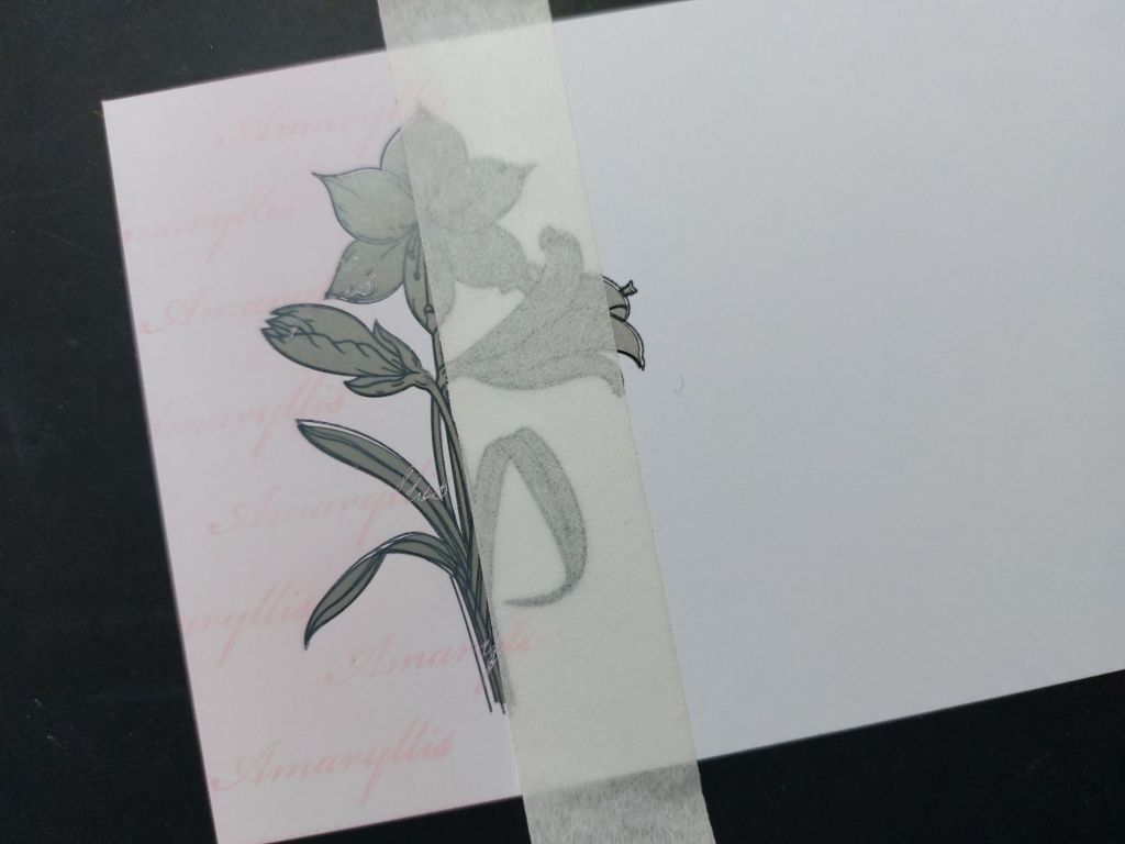 I’ve kept it simple (no surprise there, I can’t do complicated!), cutting a piece of card to fit an A6 blank and stamping the amaryllis in black Archival ink. I covered it with the pre-cut mask that comes with the stamps (so grateful – I’d have really struggled to cut this out myself!), ran a piece of low tack tape across the card and brushed ‘spun sugar’ Distress Oxide down the left to form a background panel. I gave it a bit of added interest by stamping ‘amaryllis’ (from the set) across that, also in the ‘spun sugar’.
