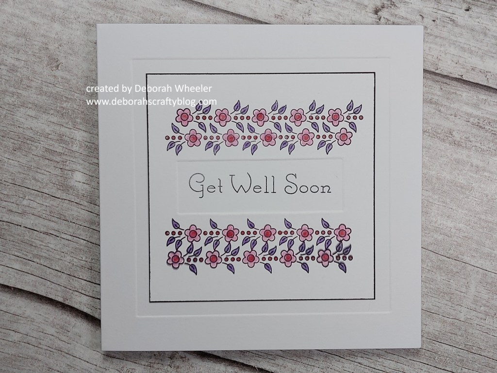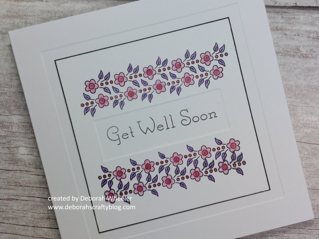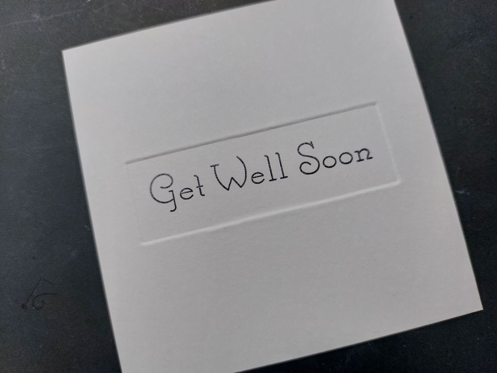First was to sort the sentiment in the centre of the layout. I took a piece of 3.5″ stencil card and stamped ‘get well soon’ across the centre with black Archival ink. I wanted to frame it with an embedder and pulled out the Sentiment Embedder Stencil (one of January’s Product of the Month) – none of them were exactly the right size, so I picked one that had the correct depth and set about lengthening it. To do that, I positioned it where I needed it for the left side, flipped the card over and embossed with a ball tool from the back, just doing the left side and part-way along the top and bottom. I could then move the embedder to the right, keeping within the embossed lines then, turning again to the reverse, I finished the top and bottom and right hand side.
