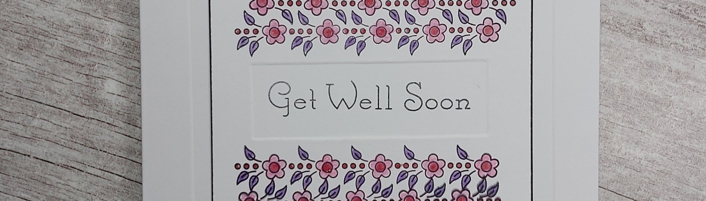 First was to sort the sentiment in the centre of the layout. I took a piece of 3.5″ stencil card and stamped ‘get well soon’ across the centre with black Archival ink. I wanted to frame it with an embedder and pulled out the Sentiment Embedder Stencil (one of January’s Product of the Month) – none of them were exactly the right size, so I picked one that had the correct depth and set about lengthening it. To do that, I positioned it where I needed it for the left side, flipped the card over and embossed with a ball tool from the back, just doing the left side and part-way along the top and bottom. I could then move the embedder to the right, keeping within the embossed lines then, turning again to the reverse, I finished the top and bottom and right hand side.