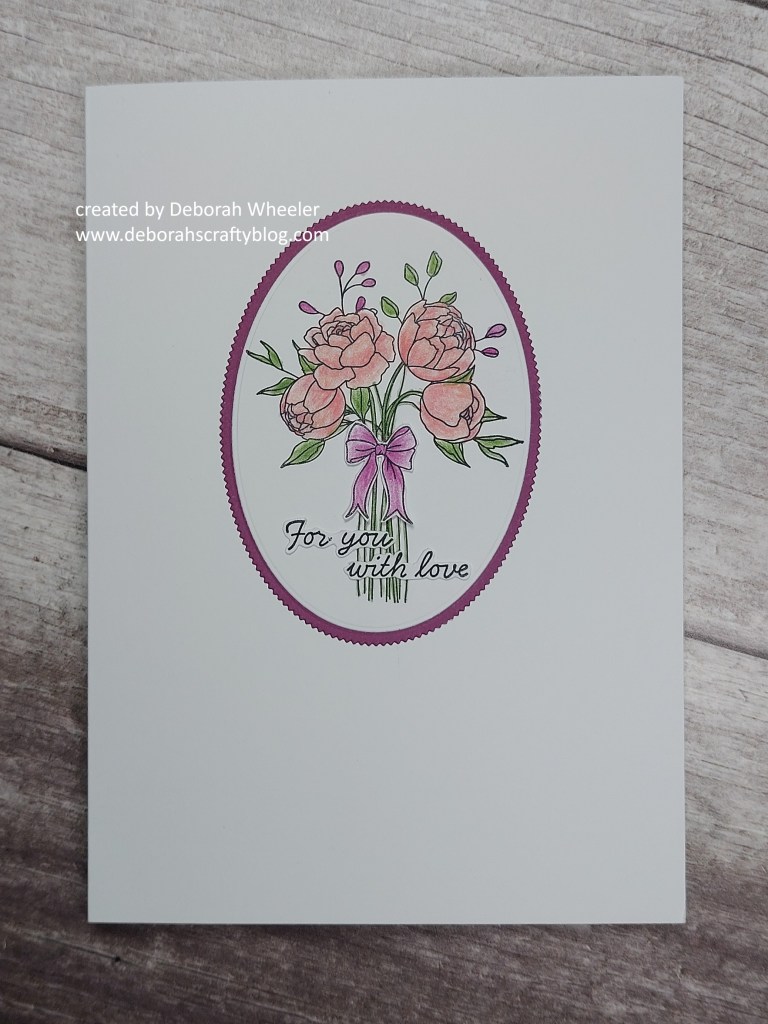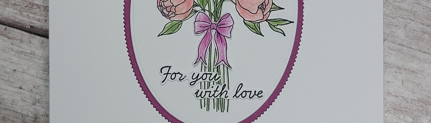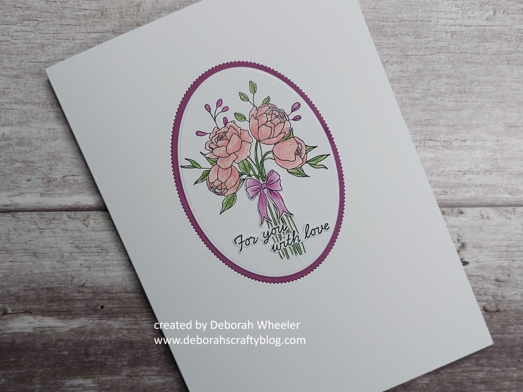I started by stamping the bouquet into white card using black Archival ink, then pencil shaded it with ‘coral’ & ‘madder’ for the blooms, ‘permanent earth green’ for the leaves and stems and the B14 Perga Colour pencil to accent the little buds. I then cut it out with a nested oval die.